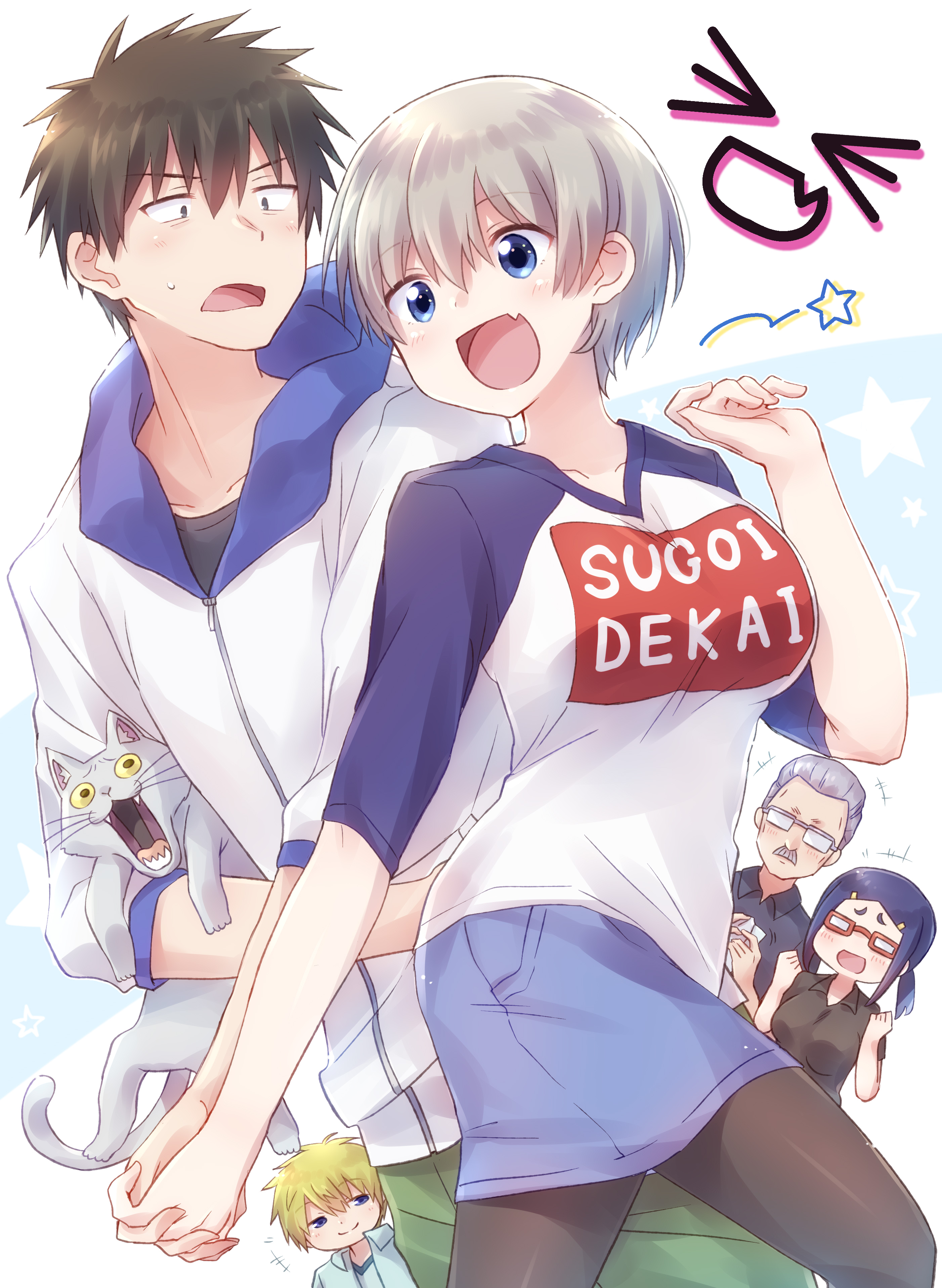 >_< 2girls 3boys absurdres asai_ami black_hair black_pantyhose black_shirt blonde_hair blue_eyes blue_skirt blue_sleeves breasts cat collared_shirt commentary cowboy_shot denim denim_skirt employee_uniform facial_hair fang glasses green_pants grey_cat grey_hair highres hood hoodie large_breasts looking_at_another mature_male multiple_boys multiple_girls mustache nyaa_(nnekoron) opaque_glasses open_mouth pants pantyhose raglan_sleeves red-framed_eyewear sakaki_itsuhito sakurai_shin'ichi shirt short_hair simple_background skin_fang skirt smile standing star_(symbol) sugoi_dekai uzaki-chan_wa_asobitai! uzaki_hana white_background white_hoodie white_shirt