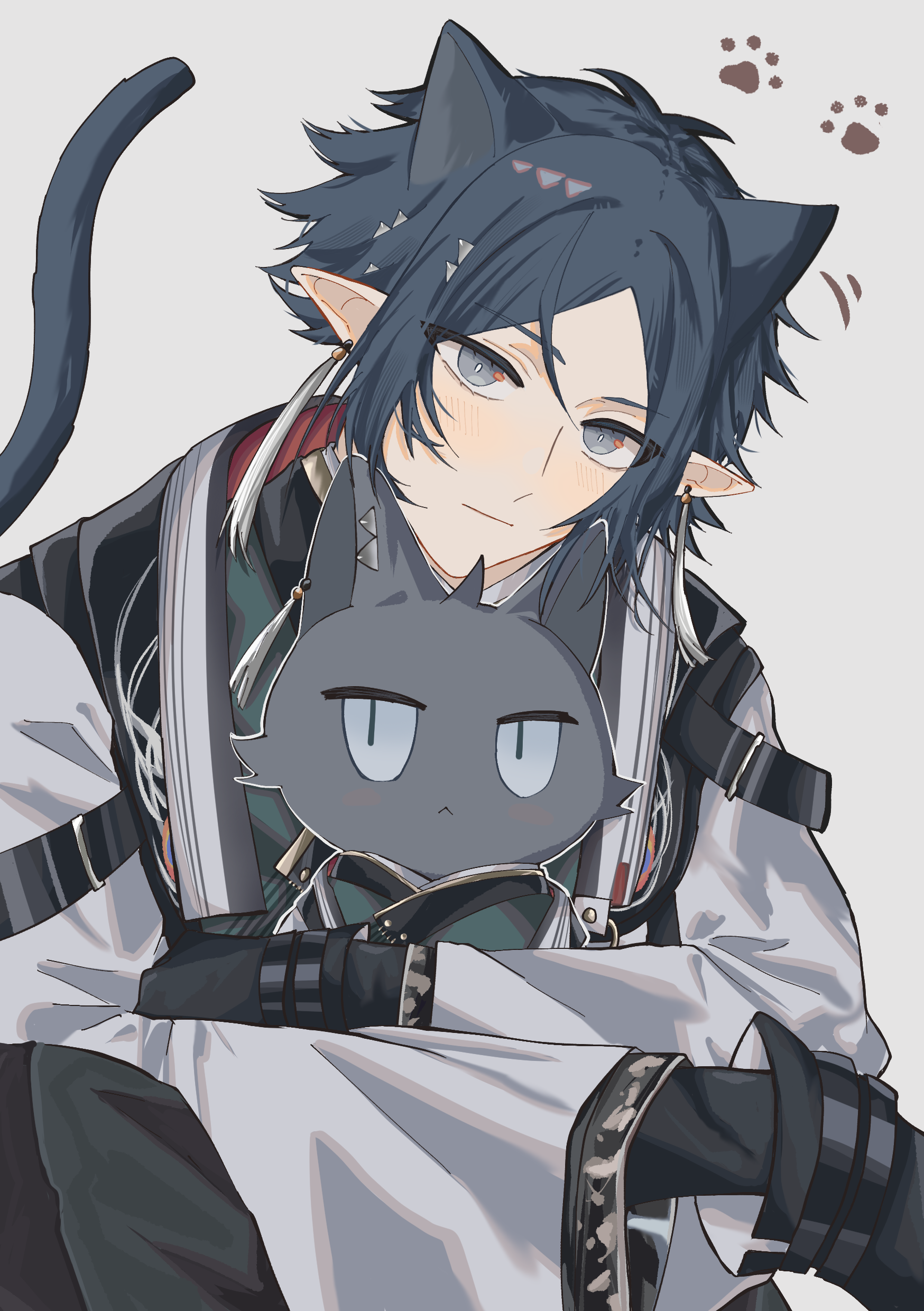 1boy absurdres animal_ears arknights aryo_77c black_gloves blue_eyes blue_hair cat_boy cat_ears cat_tail character_doll chinese_commentary choshanland_plushy_(arknights) coat commentary_request crossed_arms doll gloves green_shirt grey_background highres holding holding_doll looking_at_viewer male_focus pawpads pointy_ears shirt simple_background solo tail upper_body white_coat zuo_le_(arknights) zuo_le_(youthful_journey)_(arknights)