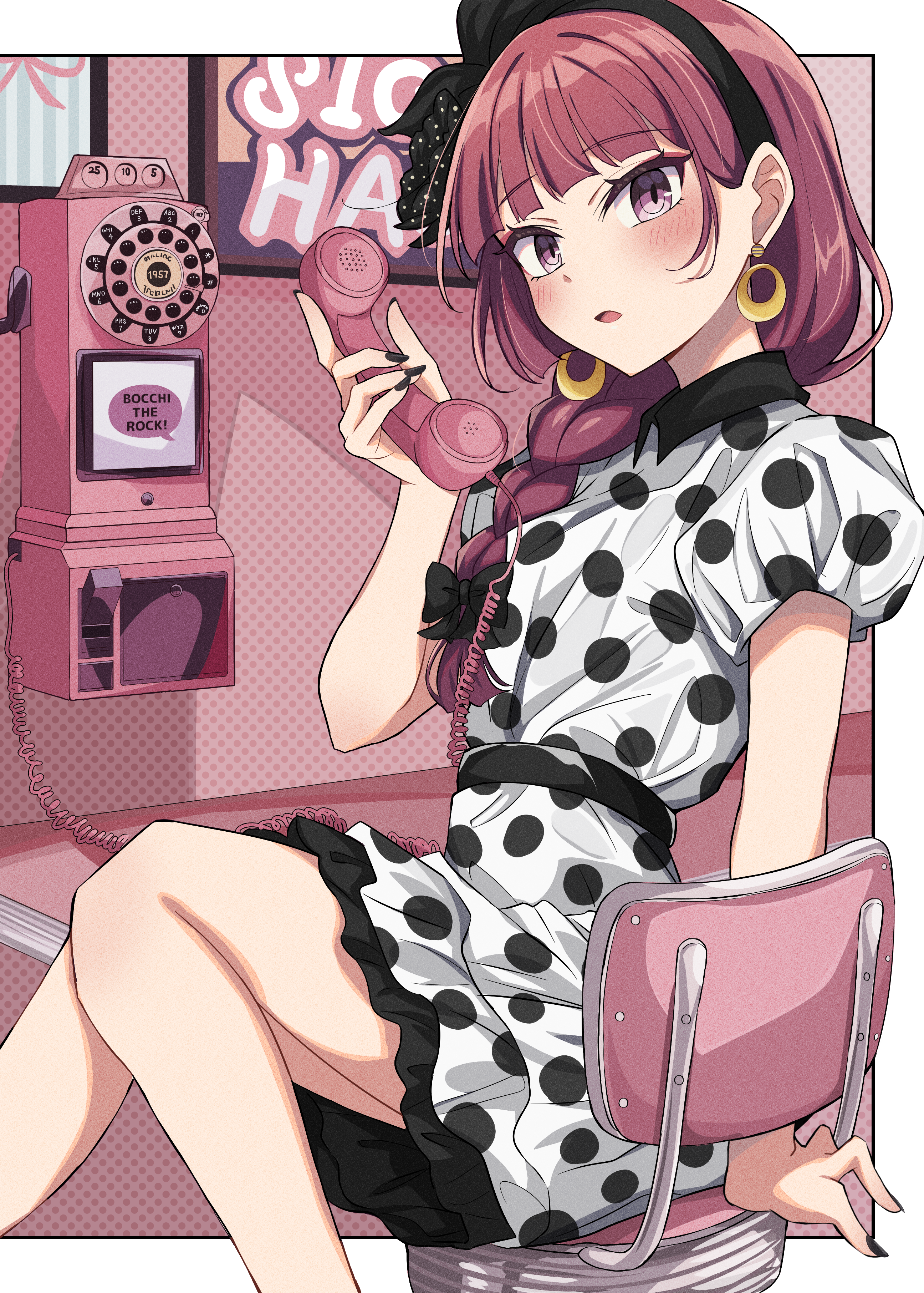1girl absurdres alternate_costume antique_phone bare_legs belt black_belt black_hairband black_nails blunt_bangs bocchi_the_rock! braid braided_ponytail chair copyright_name corded_phone dress earrings eyeshadow feet_out_of_frame film_grain frilled_dress frills gold_earrings hair_over_shoulder hairband highres hiroi_kikuri holding holding_phone jewelry looking_at_viewer makeup meiji_(meizi493) open_mouth phone pink_background polka_dot polka_dot_dress purple_eyes purple_hair red_eyeshadow rotary_phone short_sleeves single_braid sitting two-tone_dress white_dress