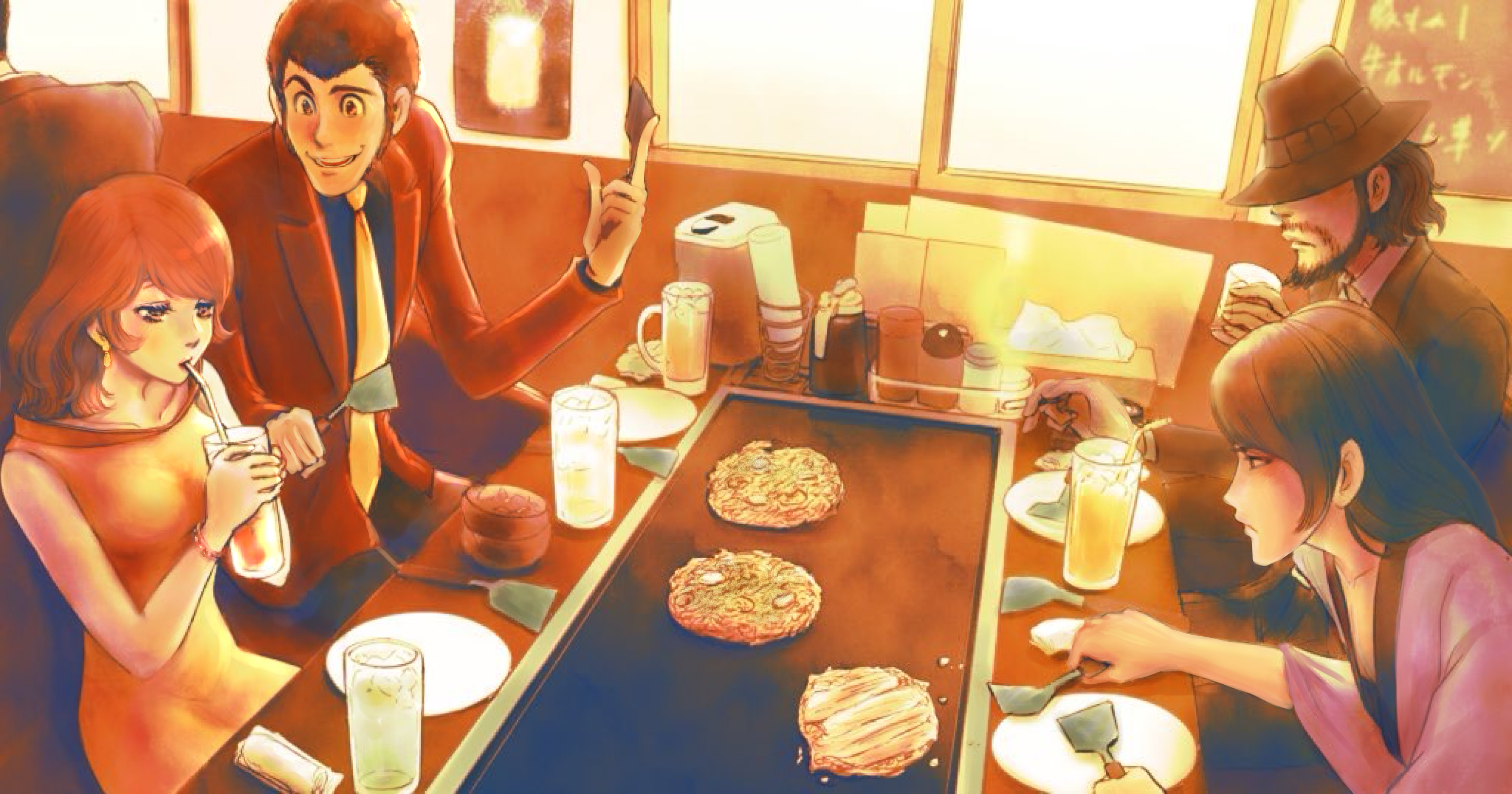 1girl 3boys arsene_lupin_iii beard beer_mug black_hair black_jacket black_suit bracelet brown_eyes cigarette cup dress drinking earrings facial_hair fedora food formal_clothes goekakisan_(adelma) hand_on_table hat hat_over_eyes highres holding holding_cigarette holding_cup holding_spatula ishikawa_goemon_xiii jacket japanese_clothes jewelry jigen_daisuke kimono lipstick long_sleeves looking_at_another looking_at_object lupin_iii makeup medium_hair mine_fujiko mug multiple_boys mustache necktie orange_dress orange_hair plate pointing red_jacket short_hair sideburns single_earring sitting smile spatula suit wing_collar yellow_necktie