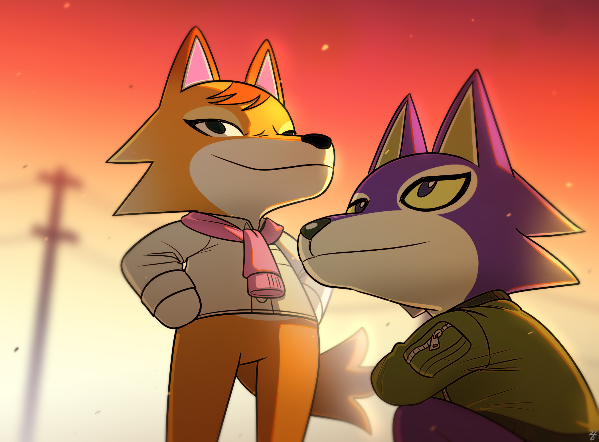 2boys animal_crossing animal_ears black_eyes blue_fur blurry blurry_background chief_(animal_crossing) commentary_request furry furry_male green_jacket highres jacket korean_commentary lobo_(animal_crossing) male_focus mixed-language_commentary multiple_boys nintendo orange_fur orange_sky outdoors pink_sweater rang_(duriri) sky smile snout standing sweater sweater_around_neck tail utility_pole wolf_boy wolf_ears wolf_tail