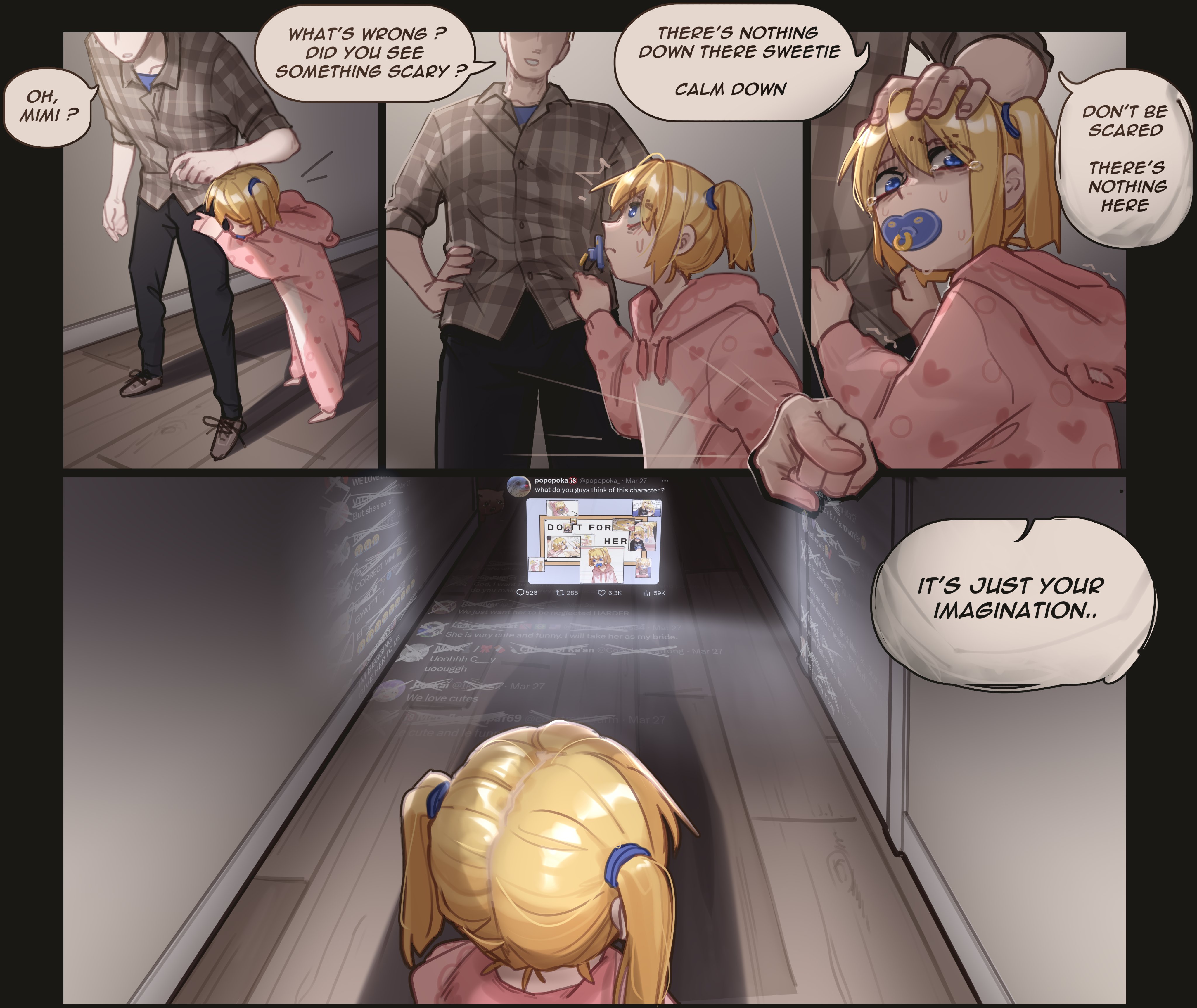 1boy 1girl absurdres blonde_hair blue_eyes commentary english_commentary english_text highres hood hood_down indoors looking_at_another mimi_(popopoka) original pacifier pajamas pants pink_pajamas plaid_clothes plaid_shirt popopoka popopoka_(character) scared shirt standing twintails
