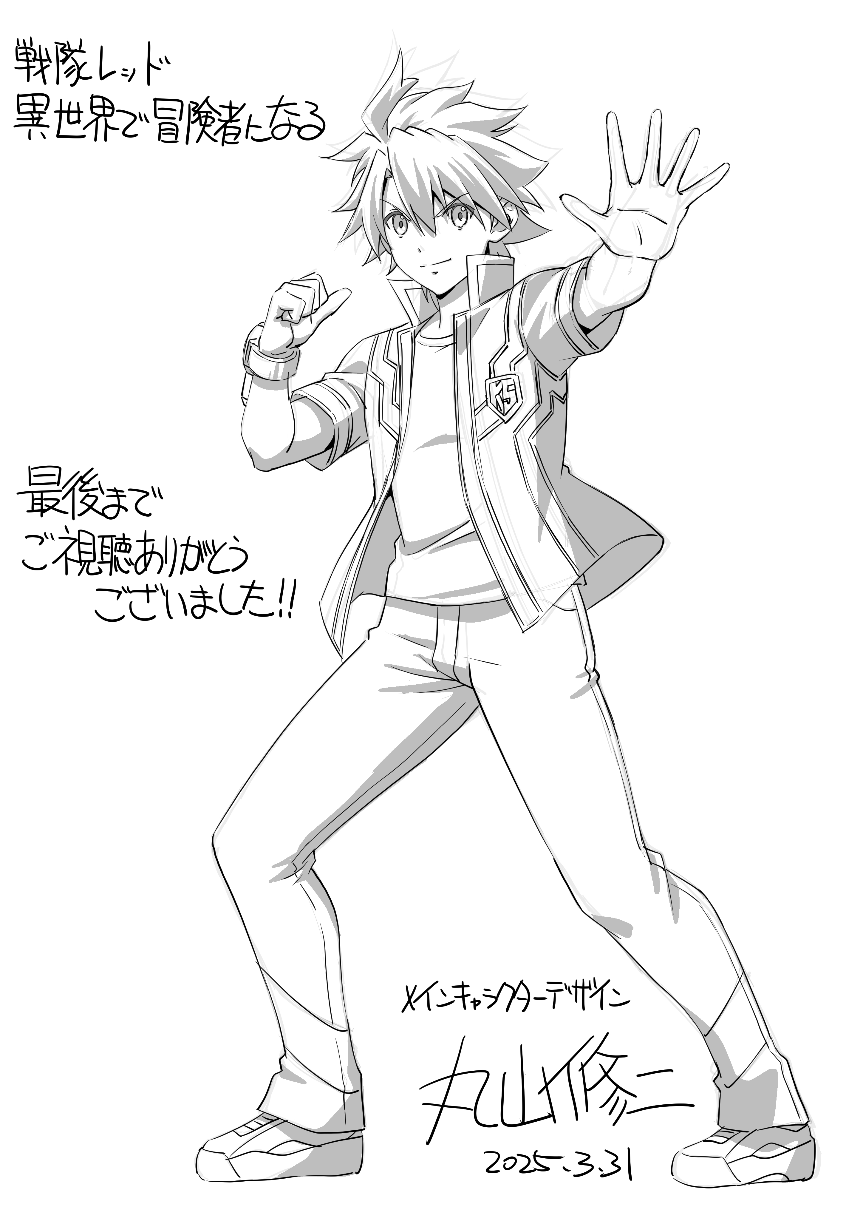 1boy absurdres asagaki_togo commentary_request dated denim full_body highres jacket lineart maruyama_shuuji open_clothes open_jacket pointing pointing_at_self sentai_red_isekai_de_boukensha_ni_naru short_hair simple_background solo translation_request white_background