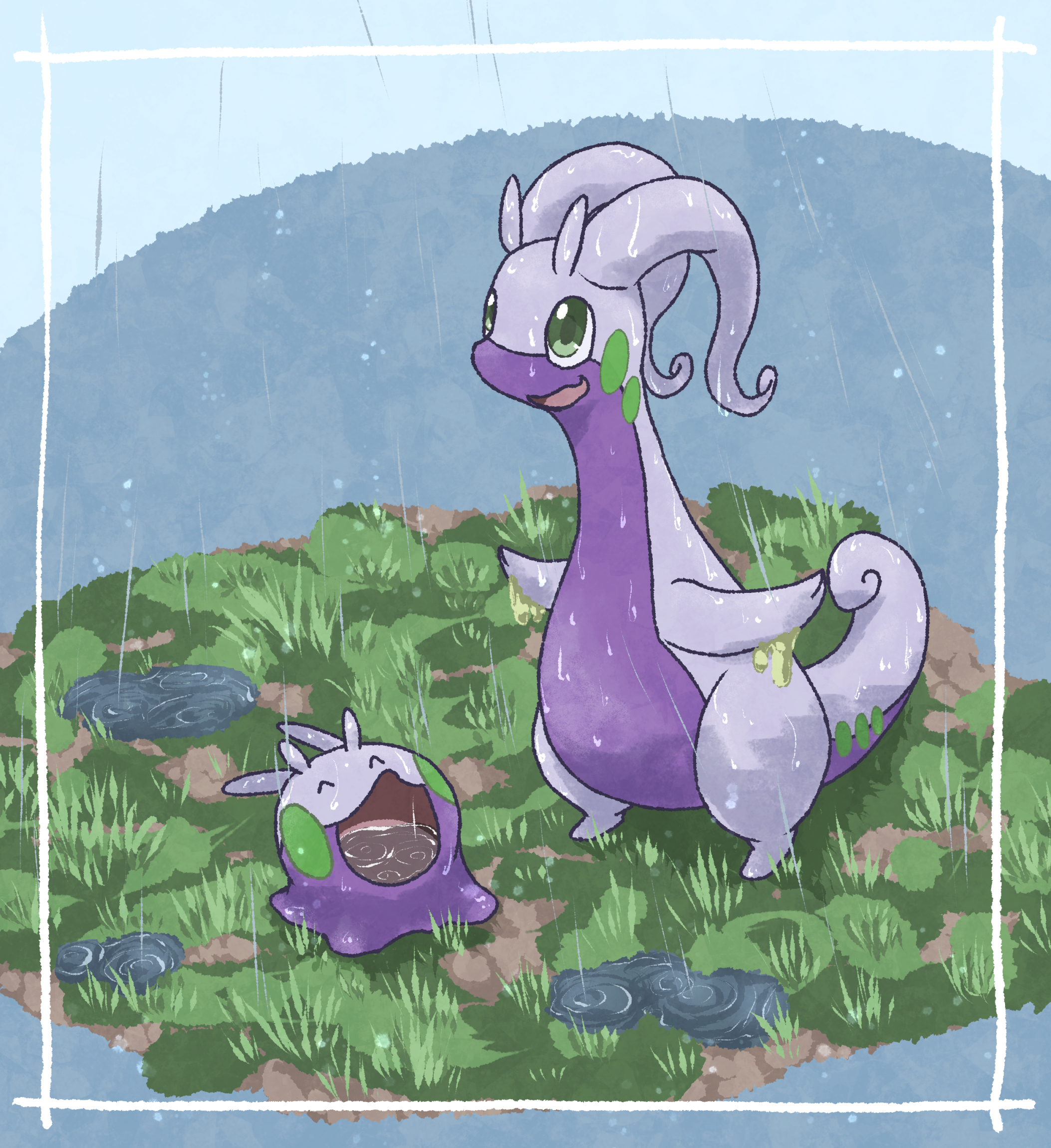 ^_^ animal_focus closed_eyes commentary_request full_body gen_6_pokemon goodra goomy grass green_eyes highres kotobukkii_(yt_lvlv) looking_up nintendo no_humans open_mouth pokemon pokemon_(creature) pokemon_focus pokemon_move puddle rain rain_dance_(pokemon) ripples slime_(substance) smile standing wet