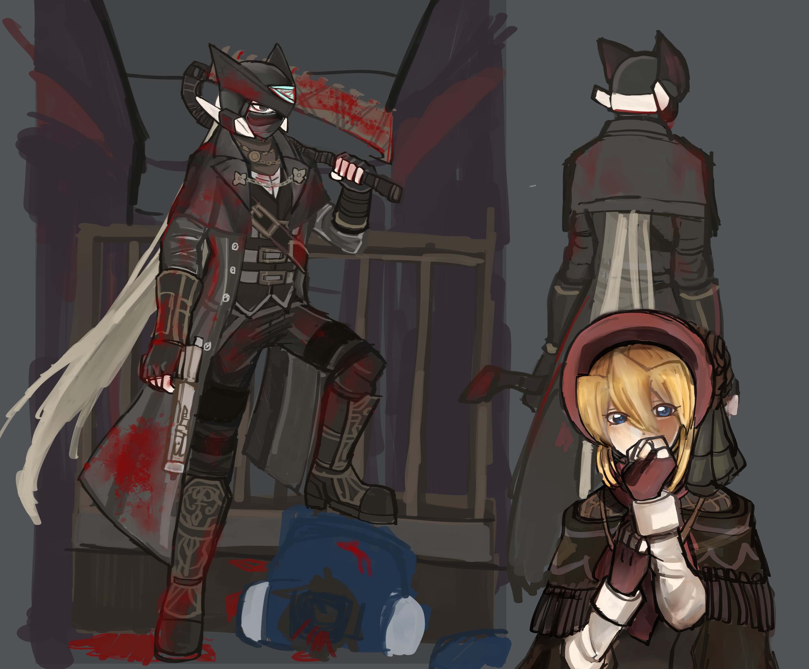1boy 1girl absurdres android black_coat blonde_hair bloodborne blue_eyes bonnet brown_vest ciel_(mega_man) cloak coat cosplay crossover forehead_jewel grey_background gun highres holding holding_gun holding_weapon hunter_(bloodborne) hunter_(bloodborne)_(cosplay) jewelry khongbautroi mega_man_(series) mega_man_zero_(series) necklace plain_doll plain_doll_(cosplay) raica_(khongbautroi) red_bonnet vest weapon zero(z)_(mega_man) zero_(mega_man)