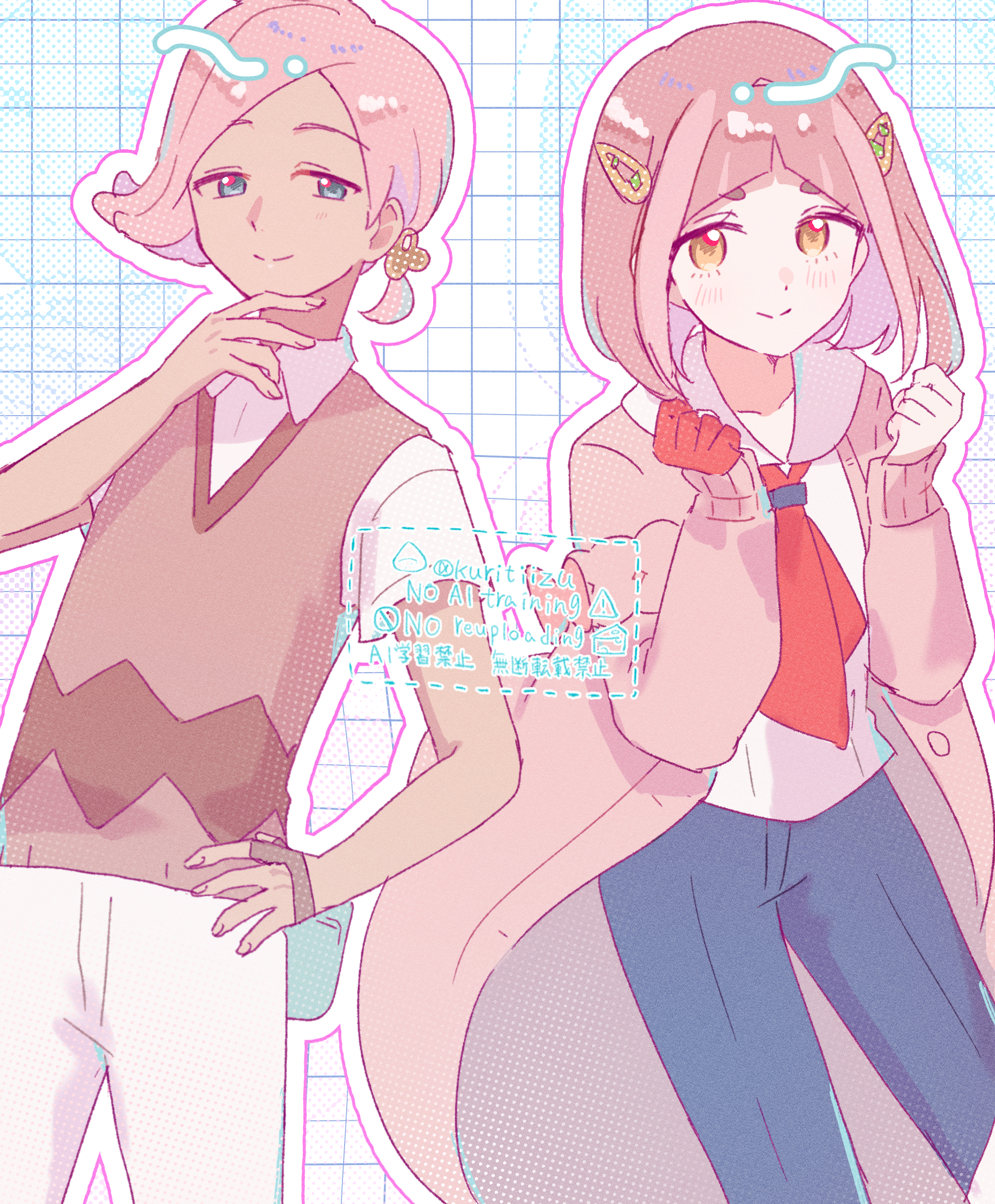1boy 1girl arched_bangs blue_eyes blush brown_vest closed_mouth collared_shirt commentary_request cowboy_shot gloves grid_background hair_ornament hairclip hand_on_own_hip hand_up hands_up highres ilima_(pokemon) jewelry kuritiizu lacey_(pokemon) long_hair looking_at_viewer necktie nintendo outline pants pink_hair pokemon pokemon_sun_and_moon pokemon_scarlet_and_violet red_gloves red_hair shirt short_hair short_sleeves single_glove smile standing sweater_vest very_long_hair vest white_pants white_shirt