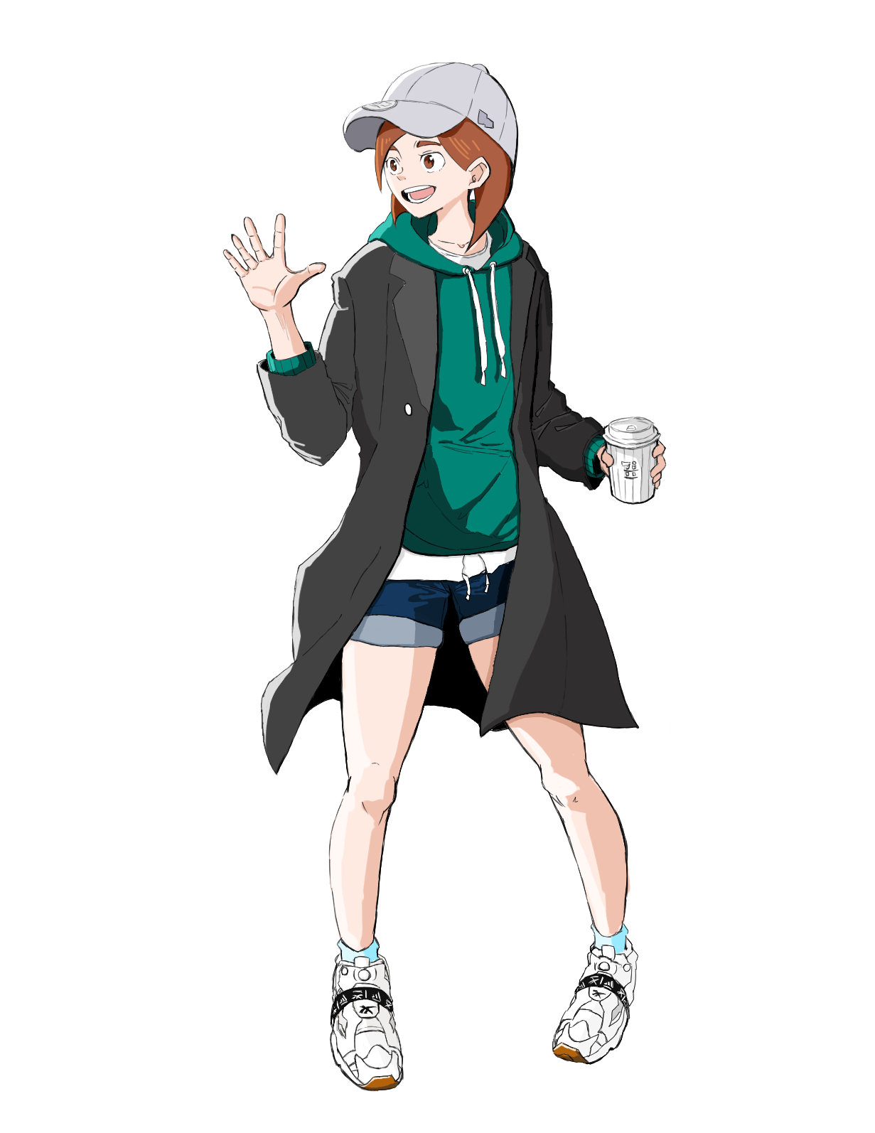 1girl :d ankle_socks aqua_socks asagaya_(colcol) baseball_cap black_coat blue_shorts bob_cut brown_eyes brown_hair casual coat collarbone commentary cup denim denim_shorts disposable_coffee_cup disposable_cup drawstring drink eizouken_ni_wa_te_wo_dasu_na! excited full_body green_hoodie hand_up happy hat highres holding holding_cup holding_drink hood hood_down hoodie inverted_bob legs_apart long_coat long_sleeves looking_afar looking_to_the_side mizusaki_tsubame open_clothes open_coat open_mouth pigeon-toed shirt shoes short_hair short_shorts shorts simple_background smile sneakers socks solo spread_fingers standing thick_eyebrows waving white_background white_hat white_shirt white_shoes