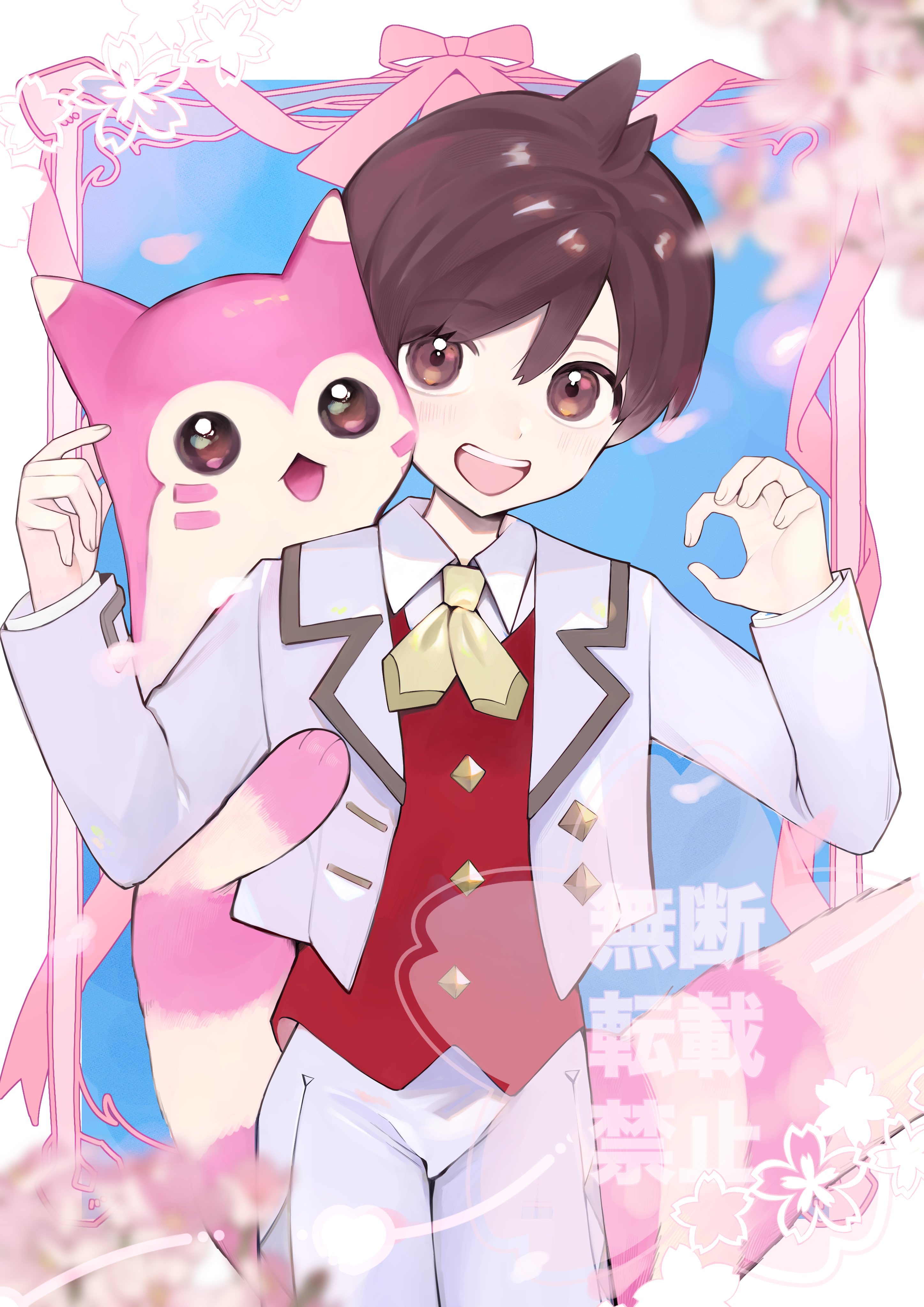 1boy absurdres alternate_color alternate_costume blurry collared_shirt commentary_request cosplay florian_(pokemon) flower furret gen_2_pokemon hands_up happy hei_tai_(kyaputen1) highres jacket long_sleeves looking_at_viewer male_focus nintendo open_clothes open_jacket pants pink_flower pink_ribbon pokemon pokemon_(creature) pokemon_masters_ex pokemon_scarlet_and_violet red_vest ribbon rosa_(academy)_(pokemon) rosa_(pokemon) rosa_(pokemon)_(cosplay) school_uniform shiny_pokemon shirt translation_request vest white_shirt