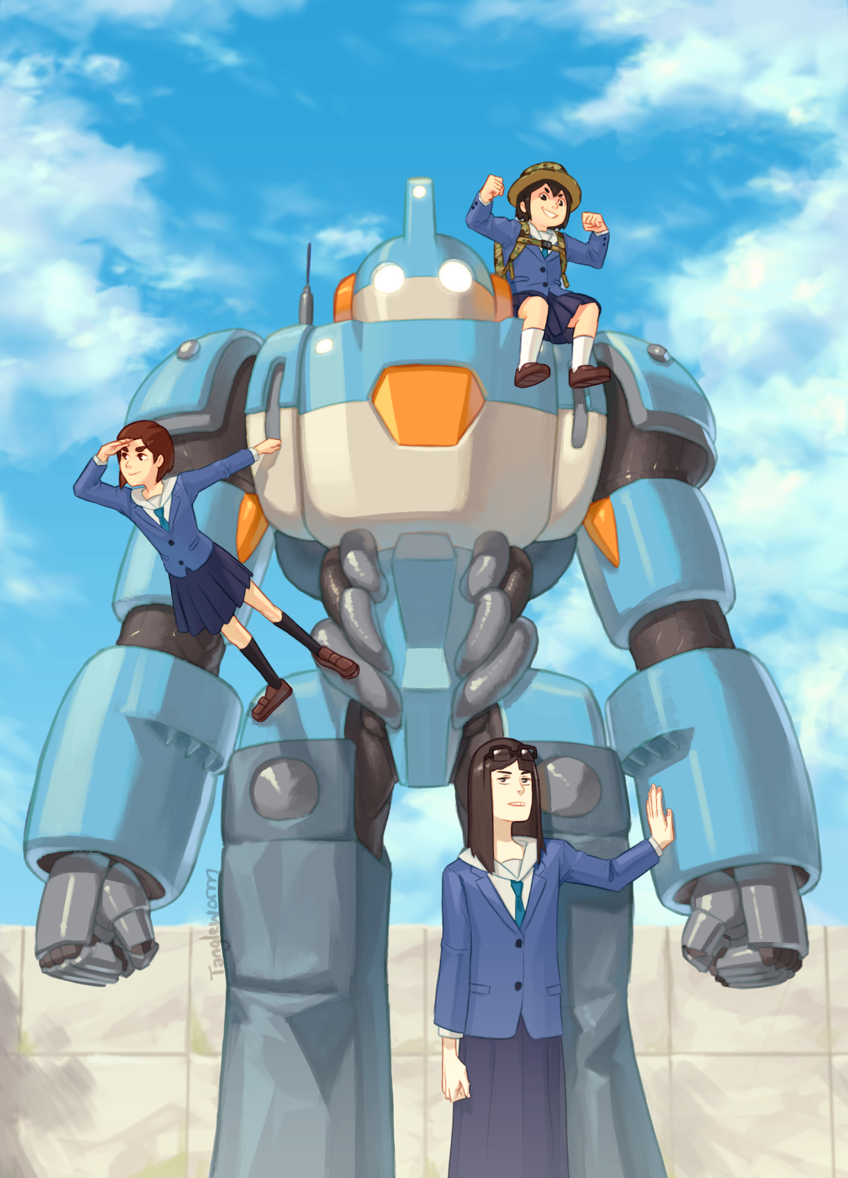 3girls aqua_necktie artist_name asakusa_midori bag black_hair black_socks blazer blue_jacket blue_skirt blue_sky bob_cut brown_eyes brown_hair brown_shoes camouflage camouflage_bag camouflage_hat climbing cloud cloudy_sky collared_shirt commentary day dress_shirt eizouken_ni_wa_te_wo_dasu_na! english_commentary eyewear_on_head fist_pump full_body glasses glowing glowing_eyes green_hat hand_on_own_forehead hands_up hanging hat highres inverted_bob jacket kanamori_sayaka kneehighs loafers long_hair long_sleeves looking_afar mizusaki_tsubame multiple_girls necktie on_shoulder outdoors over-rim_eyewear parted_lips pleated_skirt rectangular_eyewear robot school_uniform semi-rimless_eyewear shading_eyes shibahama_high_school_uniform shirt shoes short_hair signature sitting_on_robot skirt sky socks standing stone_wall tangleworm teeth thick_eyebrows white_shirt white_socks