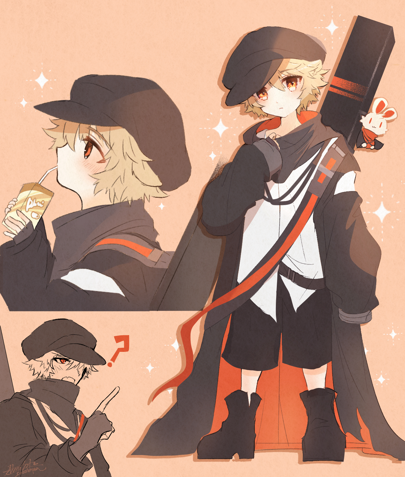 1boy ? aged_down arknights bendy_straw black_boots black_hat black_jacket black_shorts blush boots brown_background brown_hair newsboy_cap drinking_straw fingerless_gloves gloves grey_gloves hand_up hat highres holding index_finger_raised jacket long_sleeves male_focus multiple_views oonohara_kenya open_clothes open_jacket puffy_long_sleeves puffy_sleeves red_(npc)_(arknights) red_eyes shirt shorts signature simple_background sleeves_past_wrists sparkle standing white_shirt