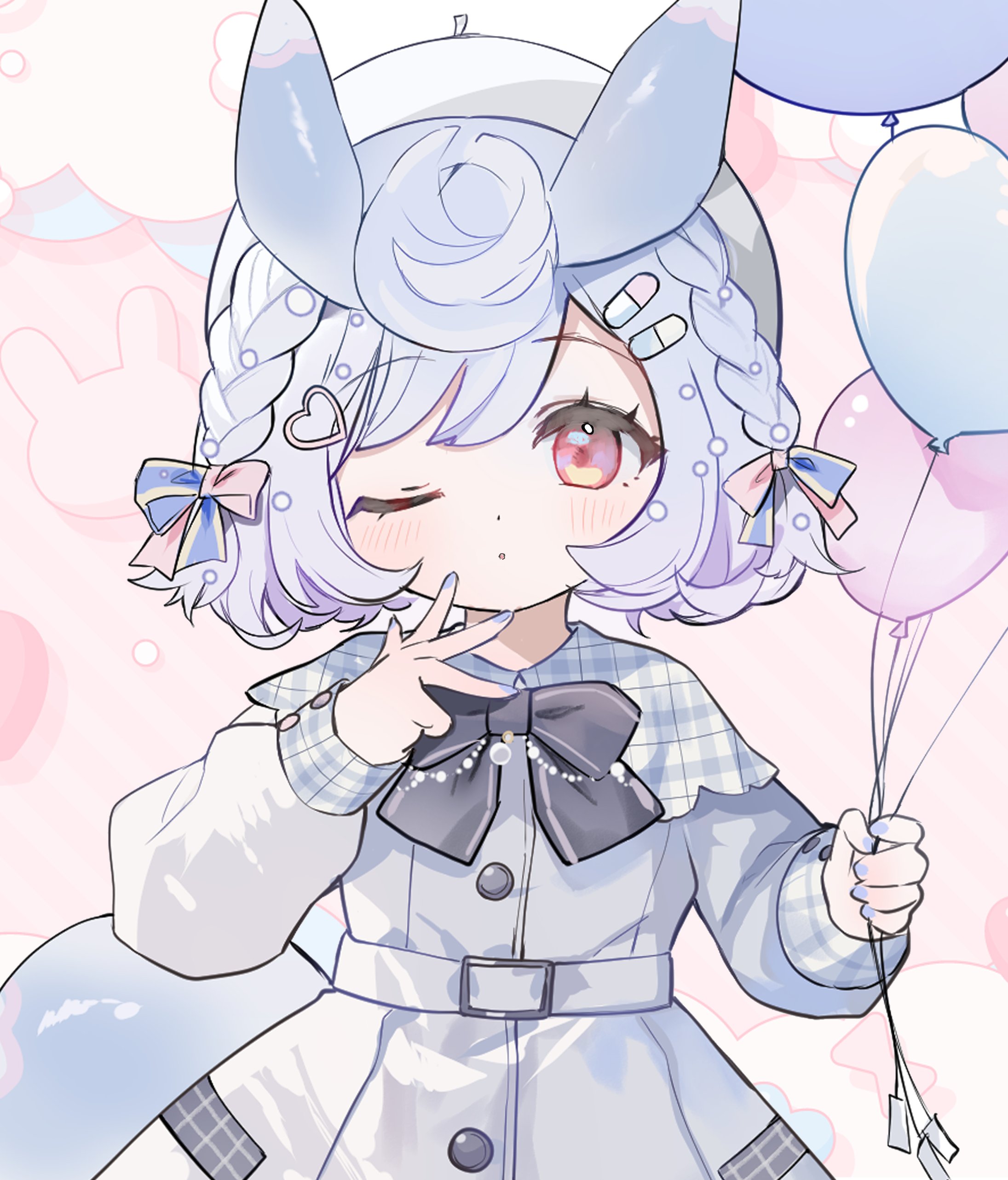 1girl ;o absurdres animal_ears balloon belt belt_buckle beret black_bow black_bowtie blue_bow blue_hair blue_nails blue_ribbon blush bow bowtie braid buckle buttons coat eyelashes fingernails genshin_impact hair_between_eyes hair_bow hair_ornament hair_ribbon hand_up hashtag-only_commentary hat heart heart_hair_ornament highres holding holding_balloon long_sleeves looking_at_viewer nail_polish one_eye_closed parted_bangs parted_lips pill_hair_ornament pink_background pink_bow pink_ribbon puffy_long_sleeves puffy_sleeves red_eyes ribbon short_hair sigewinne_(genshin_impact) solo ume_(plumblossom) white_belt white_coat white_hat