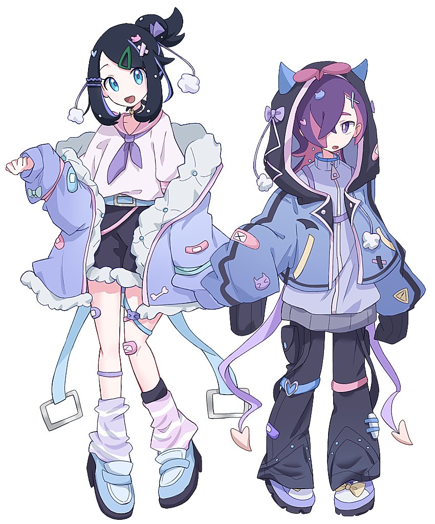 2girls black_hair blue_eyes blue_hair cowlick dot_(pokemon) eyelashes fur_jacket hair_bun hair_ornament hair_over_one_eye hairclip hood hooded_jacket horns jacket liko_(pokemon) long_hair long_sleeves looking_at_viewer multicolored_hair multiple_girls nintendo open_clothes open_mouth pants pink_hair pokemon pokemon_(anime) pokemon_horizons purple_eyes purple_hair seiun_(hoshigumo_72) shirt sleeves_past_fingers sleeves_past_wrists smile white_shirt