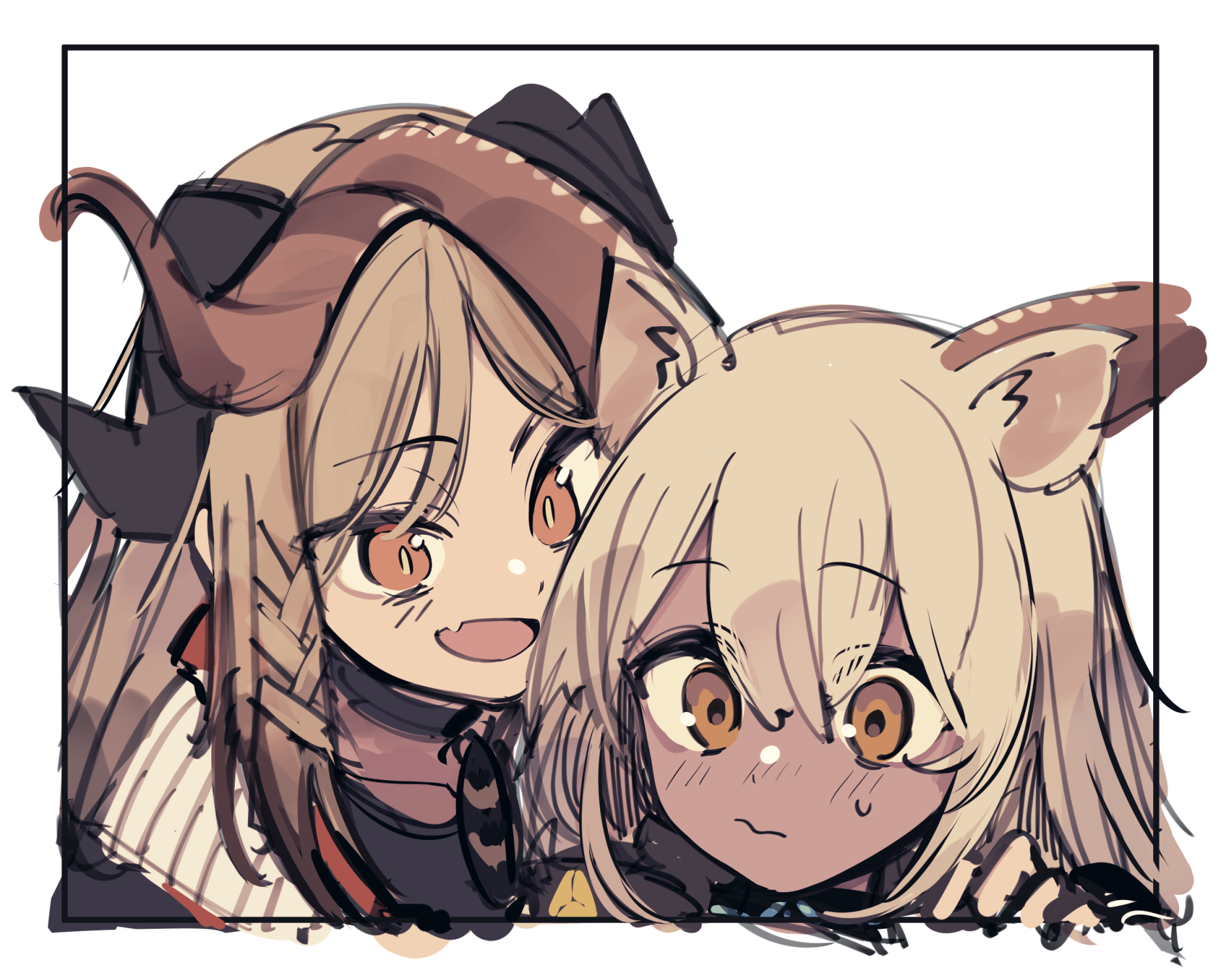 2girls :d animal_ear_fluff animal_ears arknights beeswax_(arknights) brown_eyes brown_hair character_request check_character closed_mouth dark-skinned_female dark_skin fang hair_between_eyes highres horns ifrit_(arknights) multiple_girls open_mouth simple_background small_sweatdrop smile sweat tetuw upper_body wavy_mouth white_background