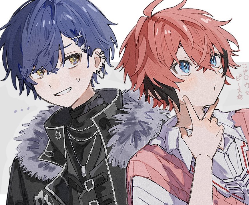 ... 2boys akagi_wen akagi_wen_(1st_costume) antenna_hair bandaid bandaid_on_cheek bandaid_on_face black_hair black_jacket black_shirt blue_eyes blue_hair blush closed_mouth collared_shirt crossed_bangs ear_piercing earrings fur-trimmed_jacket fur_trim grey_eyes hair_between_eyes hair_ornament hairclip hand_up jacket jewelry koyanagi_rou koyanagi_rou_(2nd_costume) looking_at_viewer male_focus multicolored_hair multiple_boys necklace nijisanji official_alternate_costume open_clothes open_jacket parted_bangs parted_lips piercing pink_hair pink_sweater_vest puckered_lips shirt short_hair simple_background streaked_hair sweatdrop sweater_vest translation_request turtleneck upper_body virtual_youtuber vumakuike white_background white_shirt x_hair_ornament