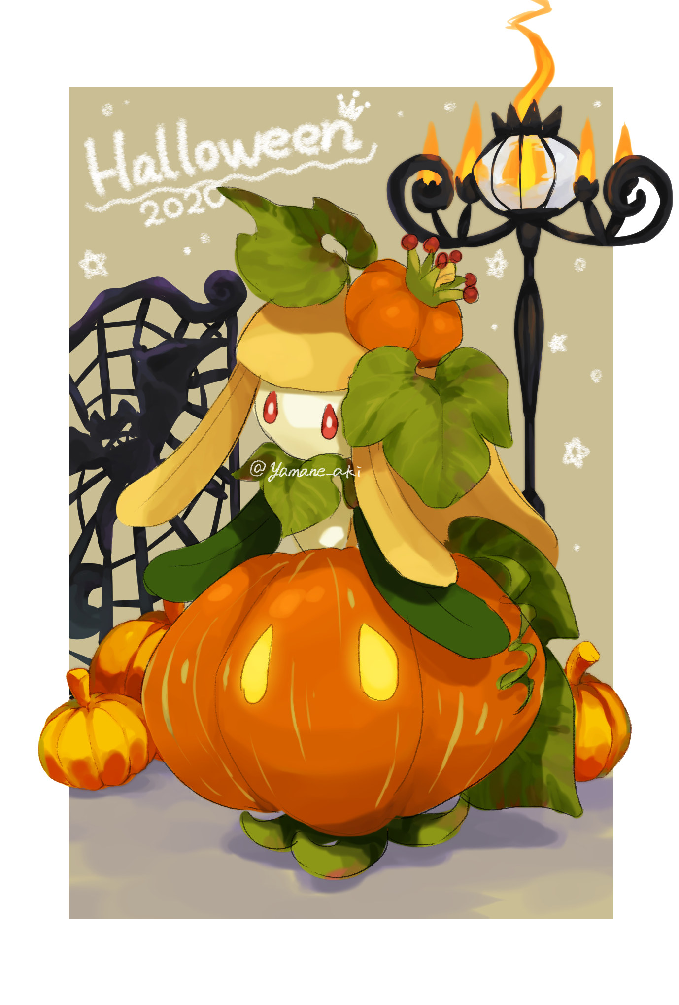 aki_yamane border chandelure commentary_request crobat fire full_body gen_2_pokemon gen_5_pokemon halloween highres lamppost leaf lilligant nintendo no_humans pokemon pokemon_(creature) red_eyes solo star_(symbol) white_border