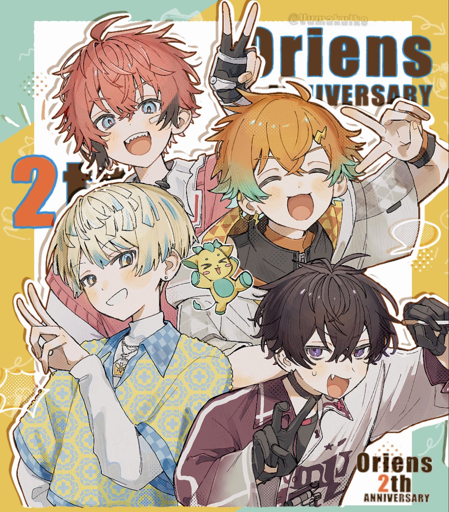 4boys :d ^_^ ahoge akagi_wen akagi_wen_(1st_costume) anniversary antenna_hair aqua_border aqua_hair artist_name bandaid bandaid_on_cheek bandaid_on_face black_choker black_gloves black_hair black_shirt blonde_hair blue_eyes blue_hair blue_shirt blush border choker cigarette closed_eyes collared_shirt commentary_request crossed_bangs earrings fang fingerless_gloves gloves gradient_hair grey_jacket grin hair_between_eyes hair_ornament hand_up hands_up hibachi_mana hibachi_mana_(1st_costume) highres holding holding_cigarette hood hood_down hooded_jacket jacket jewelry layered_sleeves lightning_bolt lightning_bolt_earrings lightning_bolt_hair_ornament lightning_bolt_symbol long_sleeves looking_at_viewer male_focus multicolored_eyes multicolored_hair multicolored_shirt multiple_boys necklace nijisanji open_mouth orange_hair orange_shirt oriens_(nijisanji) outline outside_border pink_hair pink_sweater_vest purple_eyes purple_shirt safety_pin saiki_ittetsu saiki_ittetsu_(1st_costume) sharp_teeth shirt short_hair short_over_long_sleeves short_sleeves single_earring smile streaked_hair stud_earrings sweatdrop sweater_vest teeth turtleneck twitter_username undershirt upper_body upper_teeth_only usami_rito usami_rito_(1st_costume) v v-shaped_eyebrows virtual_youtuber vumakuike white_background white_outline white_shirt wide_sleeves yellow_border yellow_eyes yellow_shirt