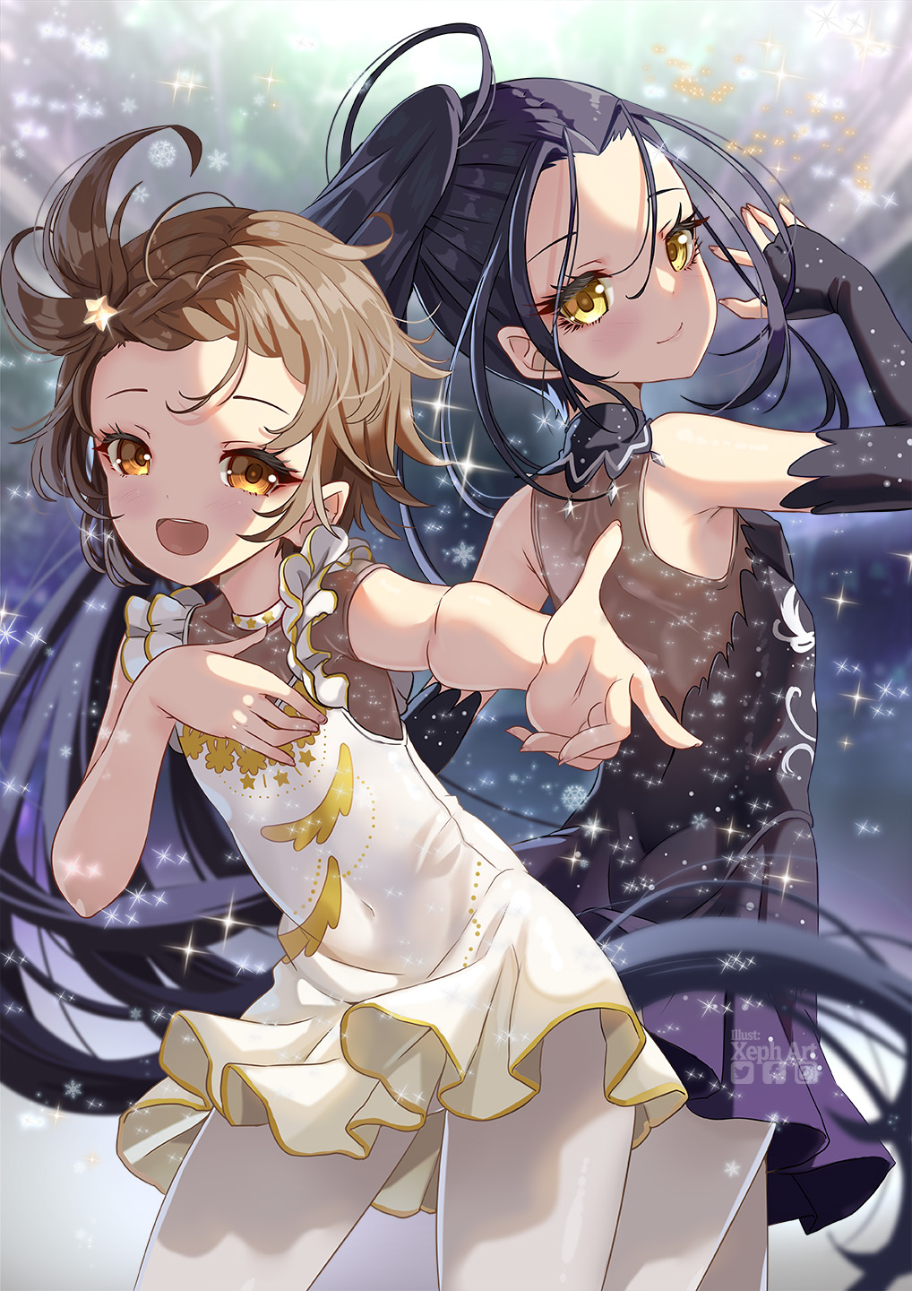 2girls :d bare_arms bare_shoulders black_dress black_gloves black_hair breasts brown_eyes brown_hair closed_mouth commentary_request dress elbow_gloves fingerless_gloves forehead gloves hair_ornament highres kamisaki_hikaru long_hair medalist_(manga) multiple_girls open_mouth outstretched_arm pantyhose side_ponytail sleeveless sleeveless_dress small_breasts smile star_(symbol) star_hair_ornament very_long_hair watermark white_dress white_pantyhose xephonia yuitsuka_inori