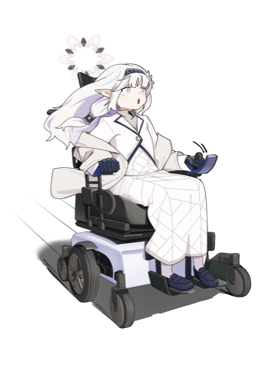 1girl adon_(dufaladanidu) black_gloves black_hairband black_shoes blue_archive blush dress excited gloves hair_ornament hairband halo highres himari_(blue_archive) jacket loafers long_hair long_sleeves motion_blur off_shoulder open_mouth pointy_ears powered_wheelchair purple_eyes shoes simple_background solo wheelchair white_background white_dress white_hair white_jacket