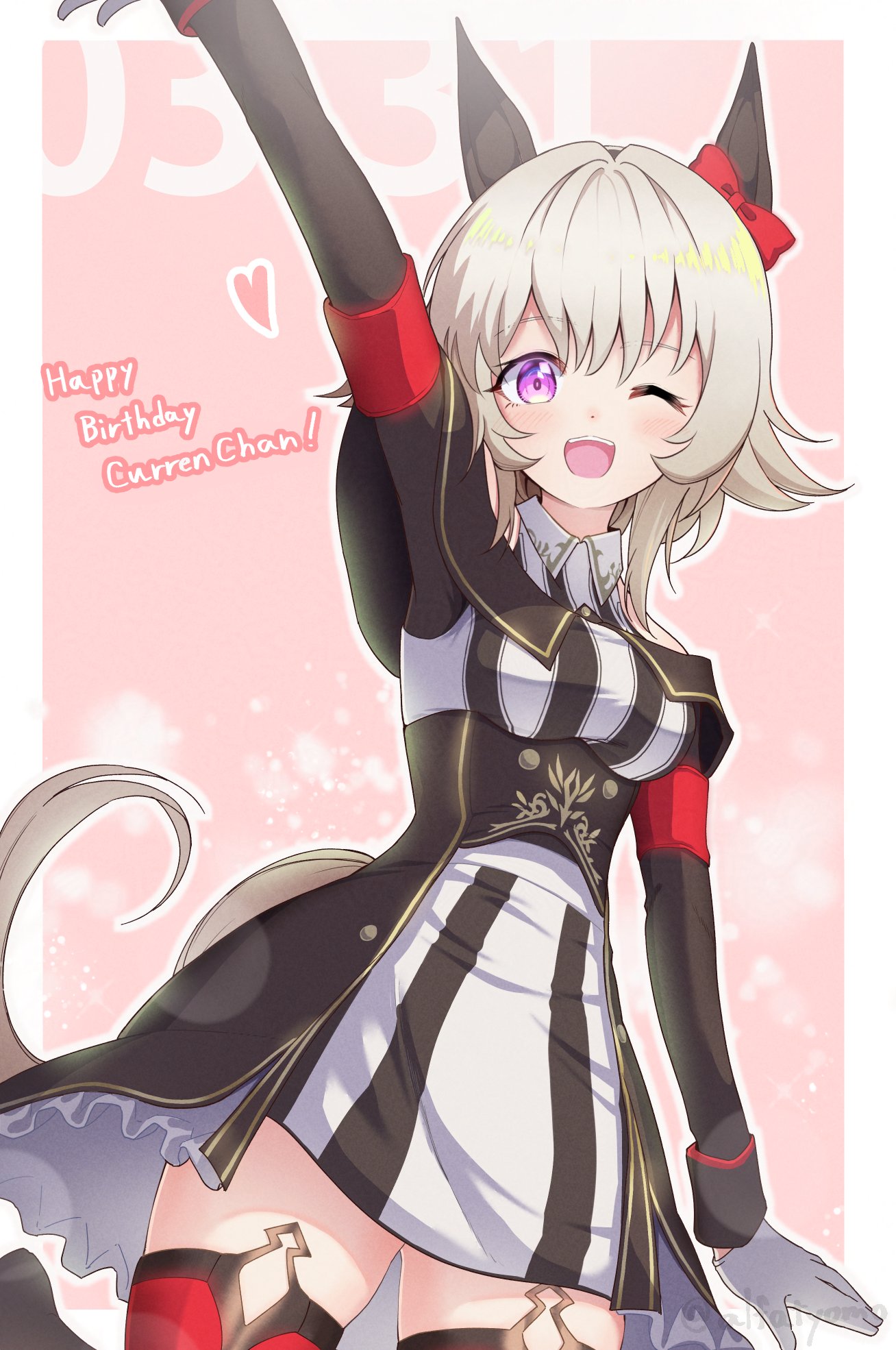 1girl ;d alfatyomo animal_ears arm_up bow breasts character_name curren_chan_(umamusume) ear_bow ear_covers grey_hair happy_birthday highres horse_ears horse_girl horse_tail long_sleeves looking_at_viewer medium_breasts off-shoulder_jacket off_shoulder one_eye_closed open_mouth purple_eyes red_bow short_hair simple_background smile solo tail umamusume white_background