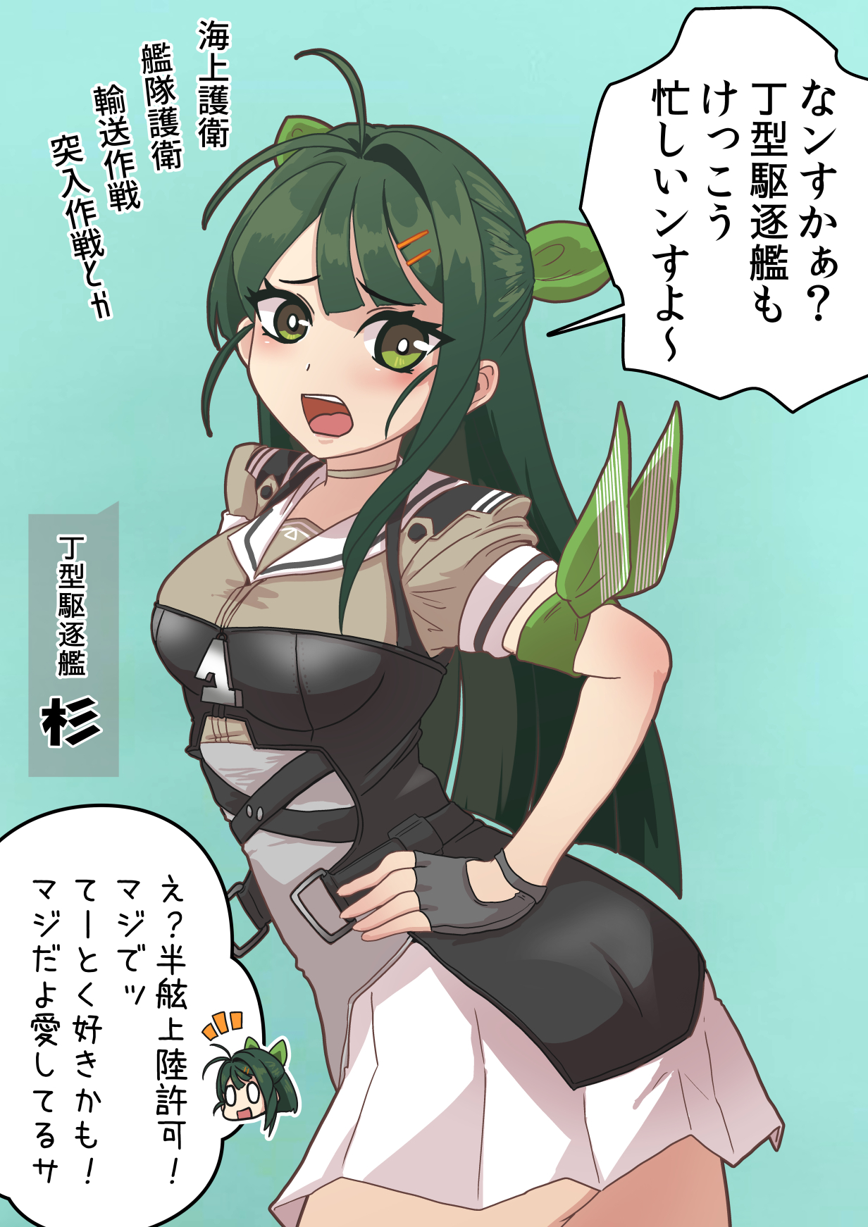 1girl ahoge apron aqua_background black_corset character_name commentary_request corset fingerless_gloves gloves green_eyes green_hair grey_apron grey_gloves grey_shirt hair_intakes hand_on_own_hip highres kantai_collection long_hair looking_at_viewer open_clothes sailor_collar shirt skirt solo sugi_(kancolle) translation_request tsun'ichi_(tsun1) white_sailor_collar white_skirt
