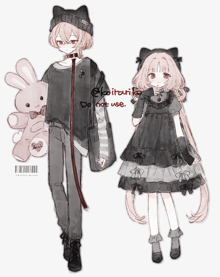 1girl animal_ear_hairband animal_ears black_dress brother_and_sister cat_ear_hairband cat_ears doll dress elbow_gloves fake_animal_ears fingerless_gloves frilled_socks frills full_body gloves hair_between_eyes hair_intakes hairband holding holding_doll koirariko layered_dress layered_sleeves lolita_fashion long_sleeves low_twintails medium_hair original oversized_clothes oversized_shirt pants parted_bangs pink_hair puffy_short_sleeves puffy_sleeves red_hair shirt short_sleeves siblings smile socks standing stuffed_toy twintails white_background yarn_hat