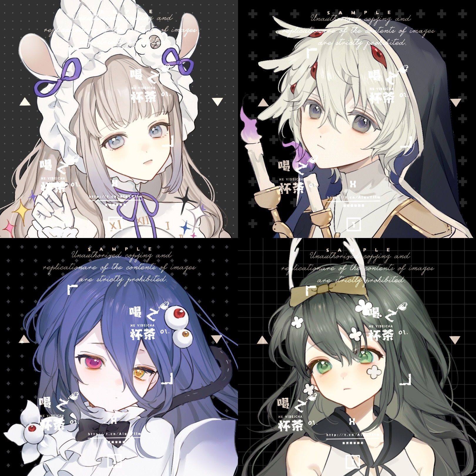 1boy 3girls animal_ears antlers ascot bad_id bad_weibo_id bare_shoulders black_bow black_bowtie black_cape black_jacket black_ribbon black_veil blue_hair blunt_bangs bonnet bow bowtie brown_bow brown_hair candle candlestand cape cleavage_cutout closed_mouth clothing_cutout collarbone colored_tips commission dot_nose epaulettes expressionless extra_eyes eye_hair_ornament eyelashes fire flower frilled_hairband frilled_wrist_cuffs frills gloves green_eyes green_hair grey_eyes grey_hair grey_shirt hair_between_eyes hair_bow hair_flower hair_ornament hair_ribbon hairband hamster_ears hand_up heterochromia heyi_beicha highres holding holding_candle horns jacket light_blush lips long_hair long_hair_between_eyes long_sleeves looking_ahead looking_at_viewer multicolored_hair multiple_girls neck_ribbon original pale_skin pink_eyes pink_lips purple_fire purple_hair purple_ribbon red_eyes ribbon sheep_horns shirt sleeveless sleeveless_shirt tentacles traditional_bowtie triangle turtleneck turtleneck_shirt upper_body veil white_ascot white_bonnet white_flower white_gloves white_hairband white_shirt white_wrist_cuffs wrist_cuffs yellow_eyes