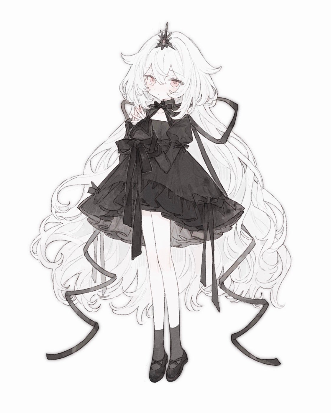 1girl black_dress black_ribbon black_socks collarbone crossed_bangs curly_hair dress frilled_dress frilled_sleeves frills full_body hair_between_eyes highres huge_bow juliet_sleeves koirariko long_hair long_sleeves original own_hands_together pink_eyes pointed_crown puffy_sleeves ribbon simple_background skirt socks solo standing very_long_hair white_background white_hair window_shadow