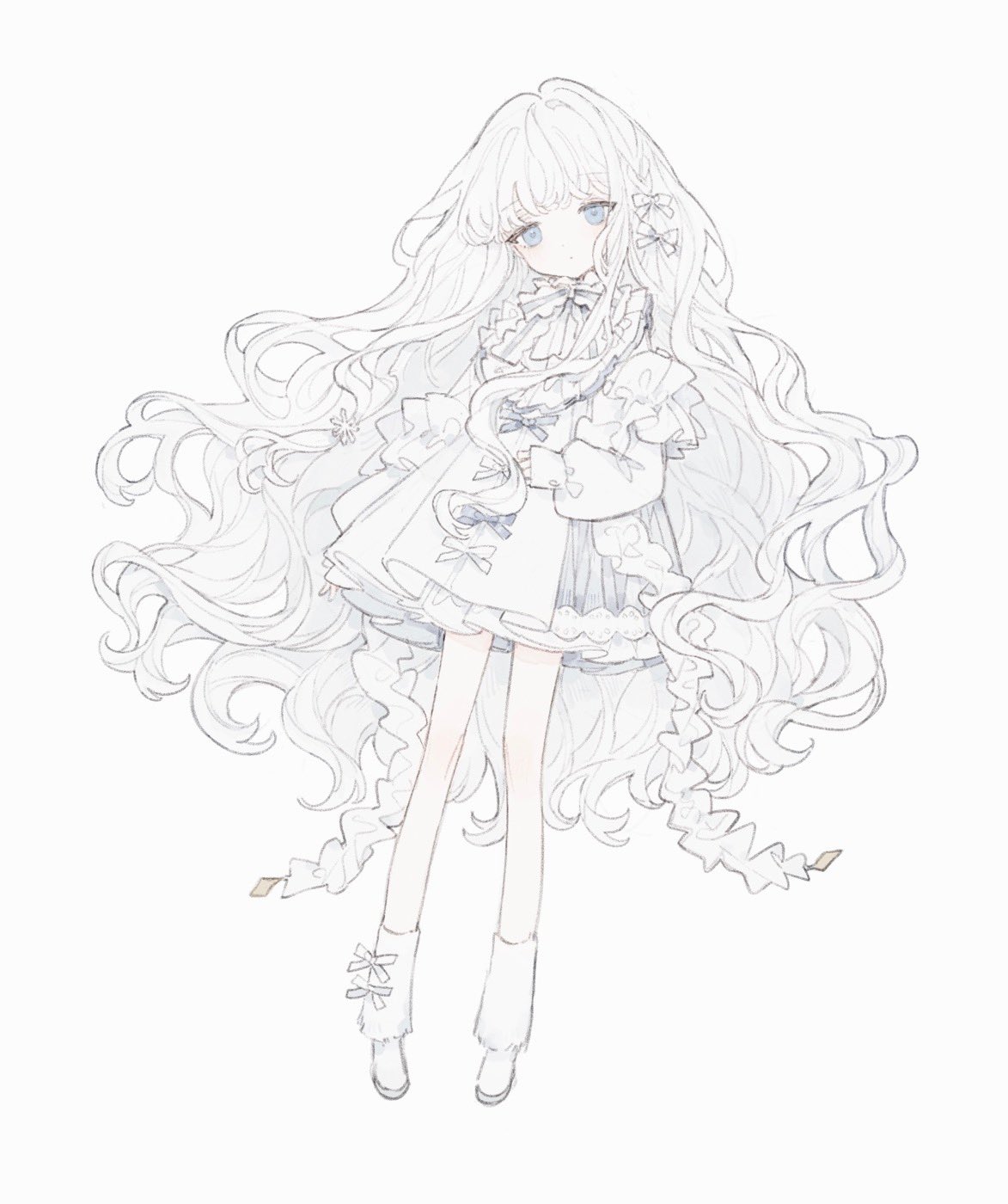 1girl blue_bow blue_dress blue_eyes blunt_bangs bow bowtie curly_hair dress emaciated expressionless frilled_dress frilled_sleeves frills full_body highres koirariko lace_trim lolita_fashion long_hair original ribbon short_dress side_slit socks solo standing sweet_lolita very_long_hair white_background white_bow white_dress white_hair white_socks