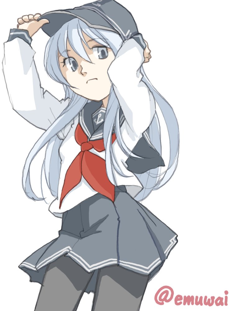 1girl anchor_symbol black_pantyhose black_sailor_collar black_skirt blue_eyes collared_shirt dress_shirt emuwai flat_cap grey_hair hat hibiki_(kancolle) kantai_collection long_hair neckerchief one-hour_drawing_challenge pantyhose pleated_skirt red_neckerchief sailor_collar sailor_shirt school_uniform serafuku shirt simple_background skirt solo twitter_username white_shirt
