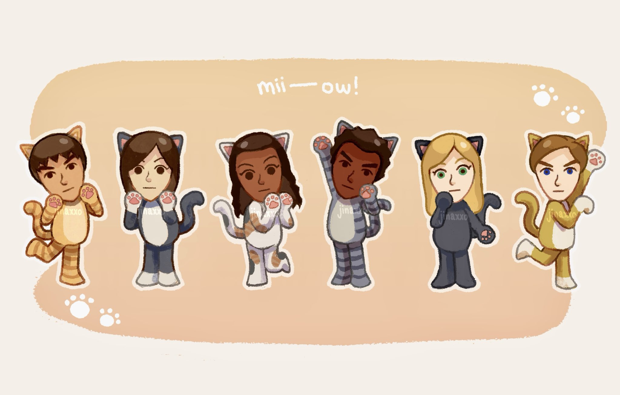 3boys 3girls :3 animal_costume animal_ears animal_hands blonde_hair blue_eyes brown_eyes brown_hair cat_boy cat_costume cat_ears cat_girl cat_tail chibi dark-skinned_male dark_skin full_body green_eyes guest_a_(mii) guest_b_(mii) guest_c_(mii) guest_d_(mii) guest_e_(mii) guest_f_(mii) highres jinaxxo kemonomimi_mode long_hair looking_at_viewer multiple_boys multiple_girls nintendo pants paw_pose paw_print short_hair smile standing tail