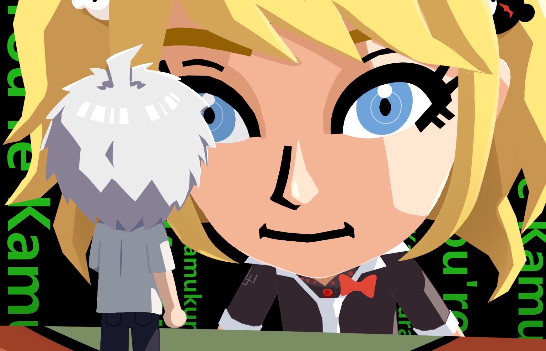 1boy 1girl ahoge bear_hair_ornament black_background black_pants black_shirt blonde_hair bow danganronpa:_trigger_happy_havoc danganronpa_(series) danganronpa_2:_goodbye_despair did_you_want_to_talk?_(meme) enoshima_junko from_behind green_eyes grey_hair hair_ornament highres hinata_hajime hinata_hajime_(awakened) kmnm_1403 meme necktie pants red_bow shirt short_hair short_sleeves smile tomodachi_life tomodachi_life:_living_the_dream upper_body white_shirt