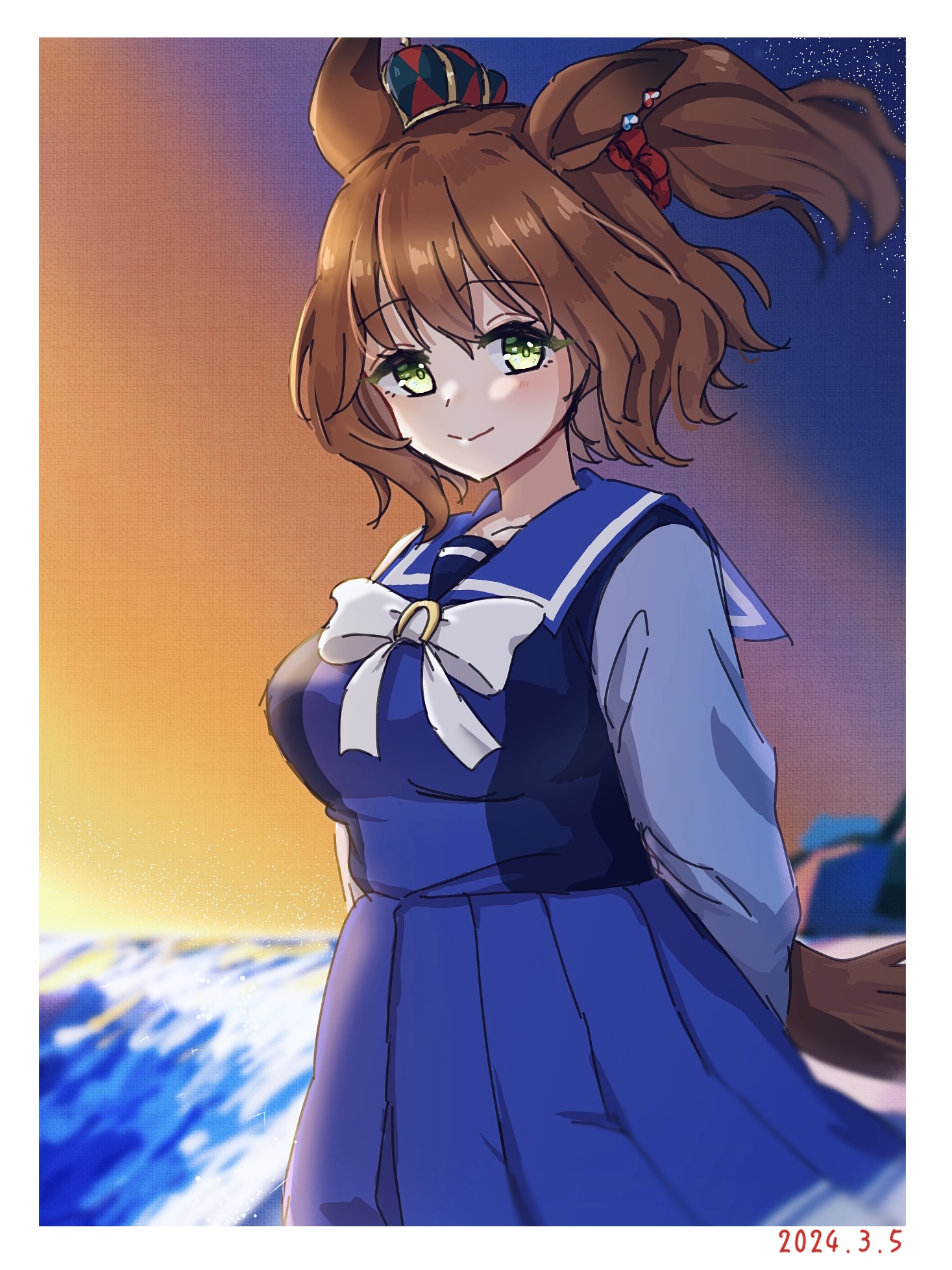 1girl animal_ears arms_behind_back aston_machan_(umamusume) blue_shirt blue_skirt bow breasts closed_mouth commentary_request crown dated green_eyes hair_between_eyes hide_oo highres horse_ears horse_girl horse_tail looking_at_viewer medium_breasts mini_crown one_side_up pleated_skirt school_uniform shirt skirt smile solo tail tilted_headwear tracen_school_uniform umamusume white_bow