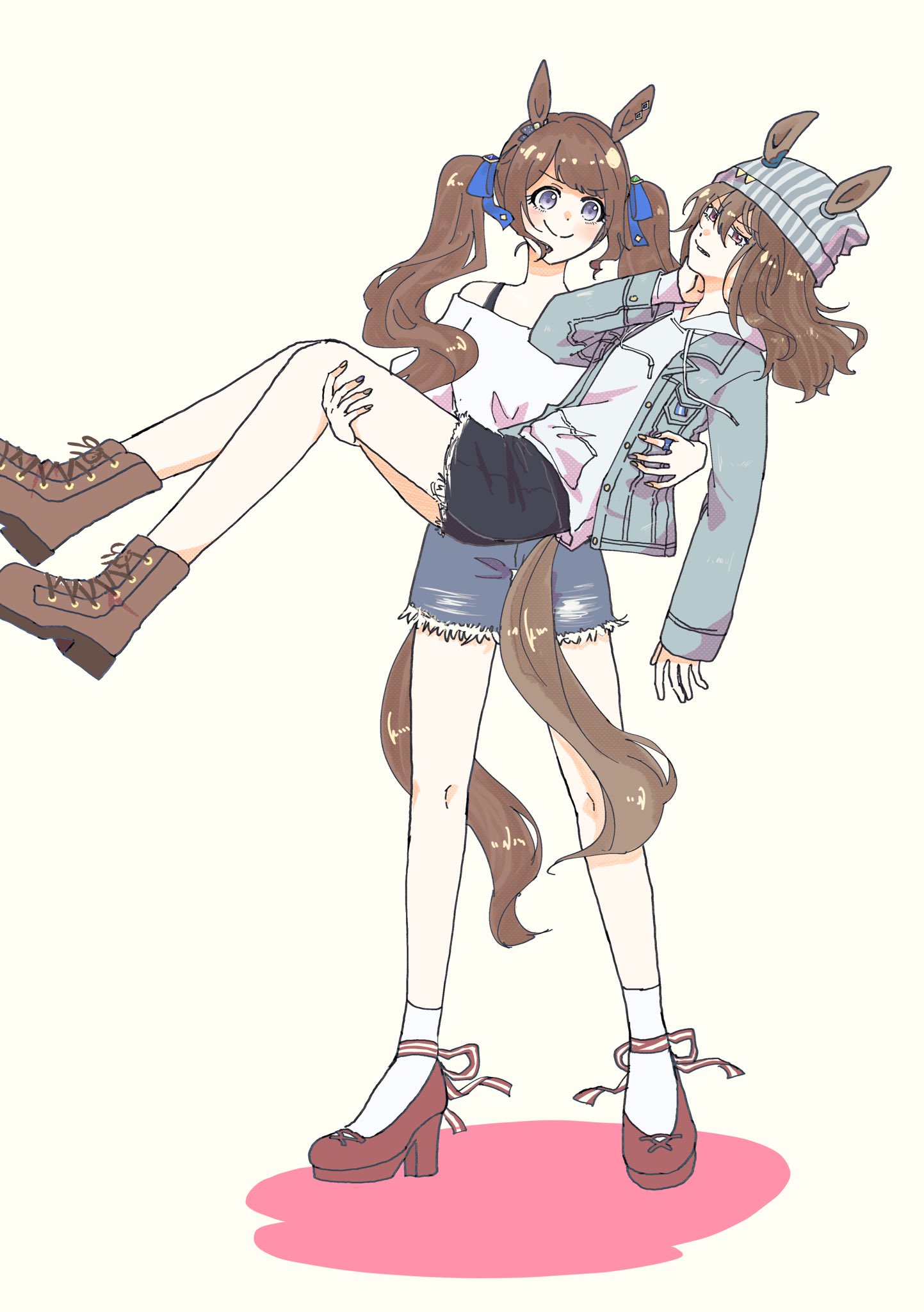 2girls animal_ears beanie blue_ribbon boots brown_boots brown_hair brown_tail carrying closed_mouth commentary_request denim denim_shorts ears_through_headwear full_body grey_hat hair_ribbon hand_on_another's_back hand_on_another's_leg hand_on_own_neck hat high_heels highres hood hoodie horse_ears horse_girl horse_tail jacket long_hair looking_at_another multiple_girls nakayama_festa_(casual)_(umamusume) nakayama_festa_(umamusume) off-shoulder_shirt off_shoulder open_clothes open_jacket princess_carry purple_eyes ribbon shirt short_shorts shorts smile socks standing tail tosen_jordan_(casual)_(umamusume) tosen_jordan_(umamusume) twintails umamusume v-shaped_eyebrows white_hoodie white_shirt white_socks yuzu4io