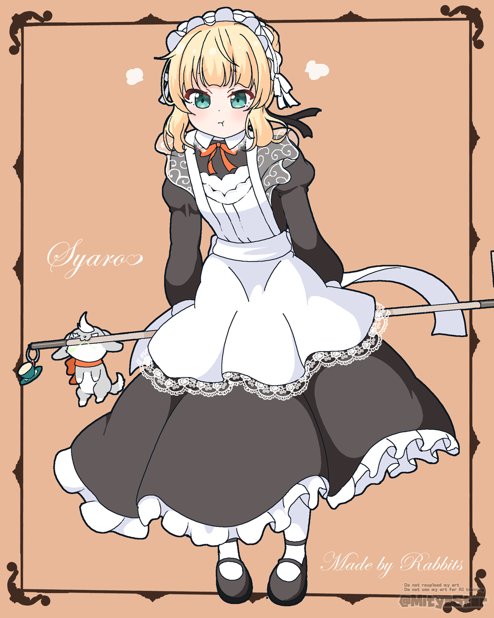 1girl :t animal apron black_dress black_shoes blonde_hair blush brown_background character_name closed_mouth commentary_request dress frilled_dress frilled_hairband frills full_body gochuumon_wa_usagi_desu_ka? green_eyes hairband highres holding juliet_sleeves kirima_syaro long_sleeves mitya pantyhose pout puffy_sleeves rabbit shoes solo_focus standing twitter_username watermark white_apron white_hairband white_pantyhose wild_geese
