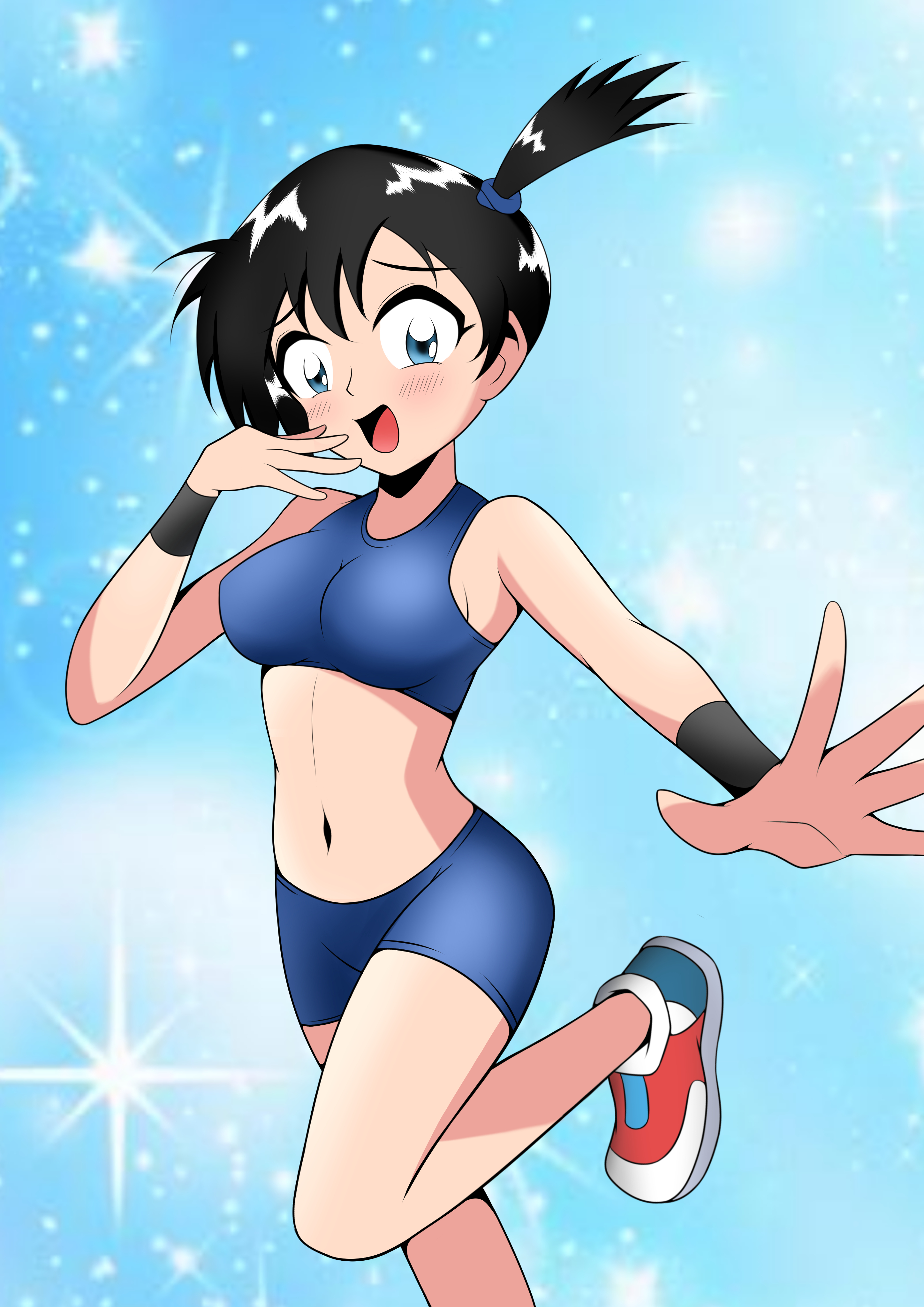 1girl :d absurdres asymmetrical_hair bare_shoulders black_hair blue_bra blue_eyes blue_shorts blue_sports_bra blush bra breasts highres looking_at_viewer medium_breasts midriff misty_(pokemon) navel nintendo open_mouth pokemon pokemon:_the_electric_tale_of_pikachu pokemon_frlg pokemon_tcg pokemon_tcg_pocket ponytail scrunchie shoes short_hair short_shorts short_twintails shorts side_ponytail smile sneakers solo sports_bra sportswear standing standing_on_one_leg swimsuit twintails underwear wristband
