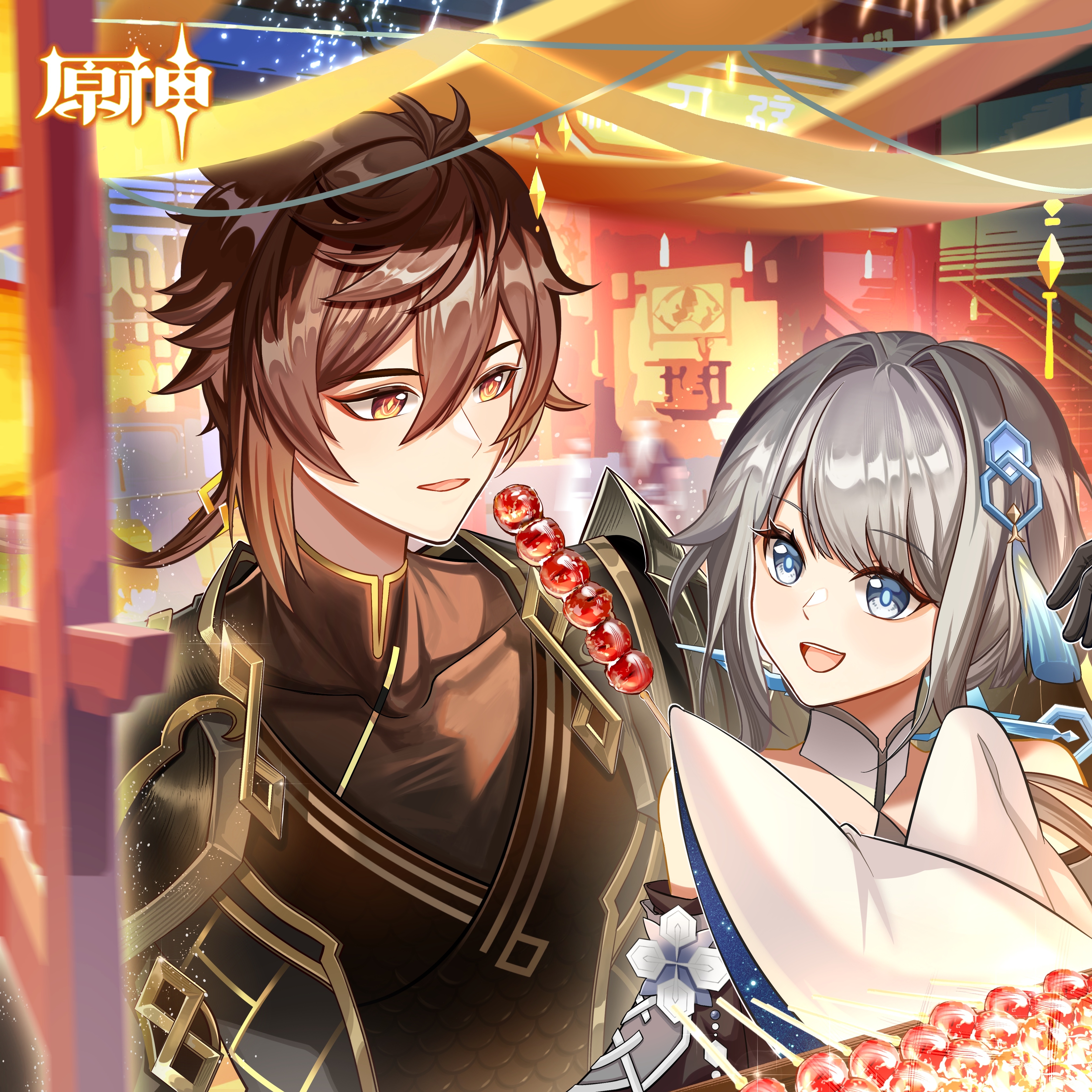 1boy 1girl absurdres architecture bare_shoulders blue_eyes brown_hair buzhidaogaishenmeming90675 changpao chinese_clothes couple east_asian_architecture eyeshadow genshin_impact grey_hair guizhong_(genshin_impact) hair_between_eyes hair_ornament highres long_hair long_sleeves makeup mandarin_collar official_alternate_costume open_mouth red_eyeshadow sleeves_past_fingers sleeves_past_wrists smile tanghulu tassel tassel_hair_ornament yellow_eyes zhongli_(genshin_impact) zhongli_(lantern_rite)_(genshin_impact)