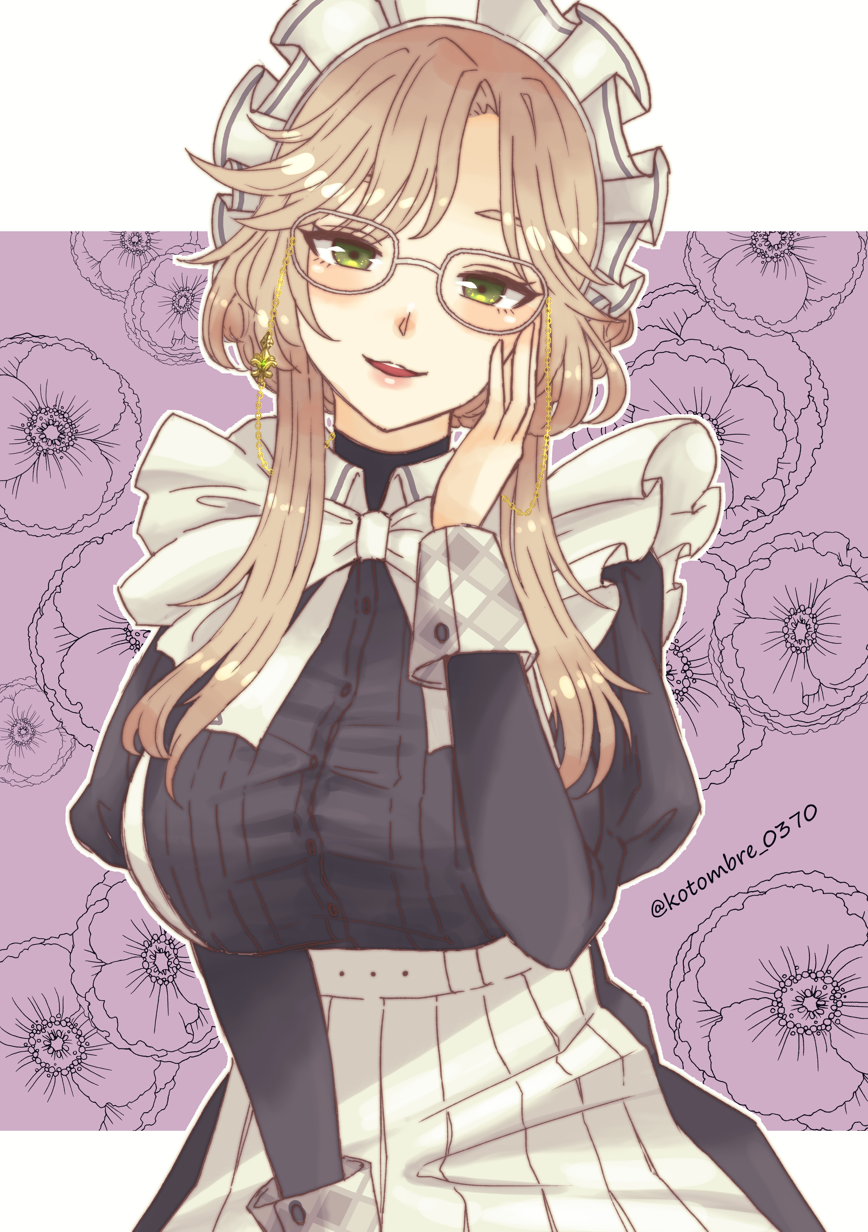 1girl absurdres ade_(nikke) apron black_dress blonde_hair bow braid breasts dress frills glasses goddess_of_victory:_nikke green_eyes highres i_(kotombre_0370) juliet_sleeves large_breasts long_hair long_sleeves looking_at_viewer maid maid_headdress open_mouth puffy_sleeves smile white_apron