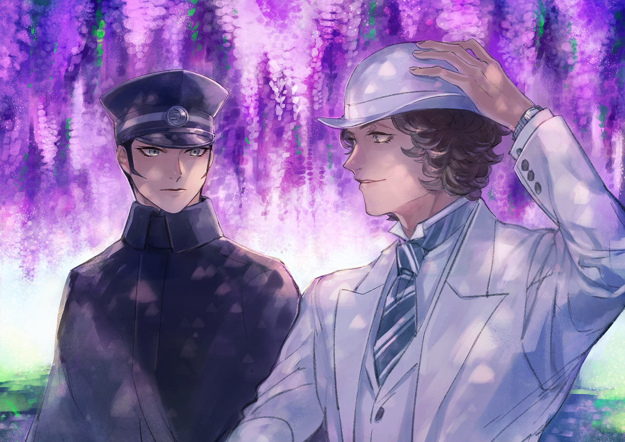 2boys black_cloak blue_necktie bowler_hat buttoned_cuffs buttons cloak curly_hair devil_summoner:_raidou_kuzunoha_vs_the_soulless_army devil_summoner_(series) devil_summoner_2:_raidou_kuzunoha_vs_king_abaddon formal_clothes grey_eyes hand_on_headwear hat high_collar jacket kamizawa_(sark) kuzunoha_raidou long_sleeves looking_at_another male_focus multiple_boys narumi_shouhei necktie peaked_cap popped_collar shako_cap shirt short_hair sideburns striped_clothes striped_necktie suit upper_body white_hat white_jacket white_shirt white_suit wingtip_collar