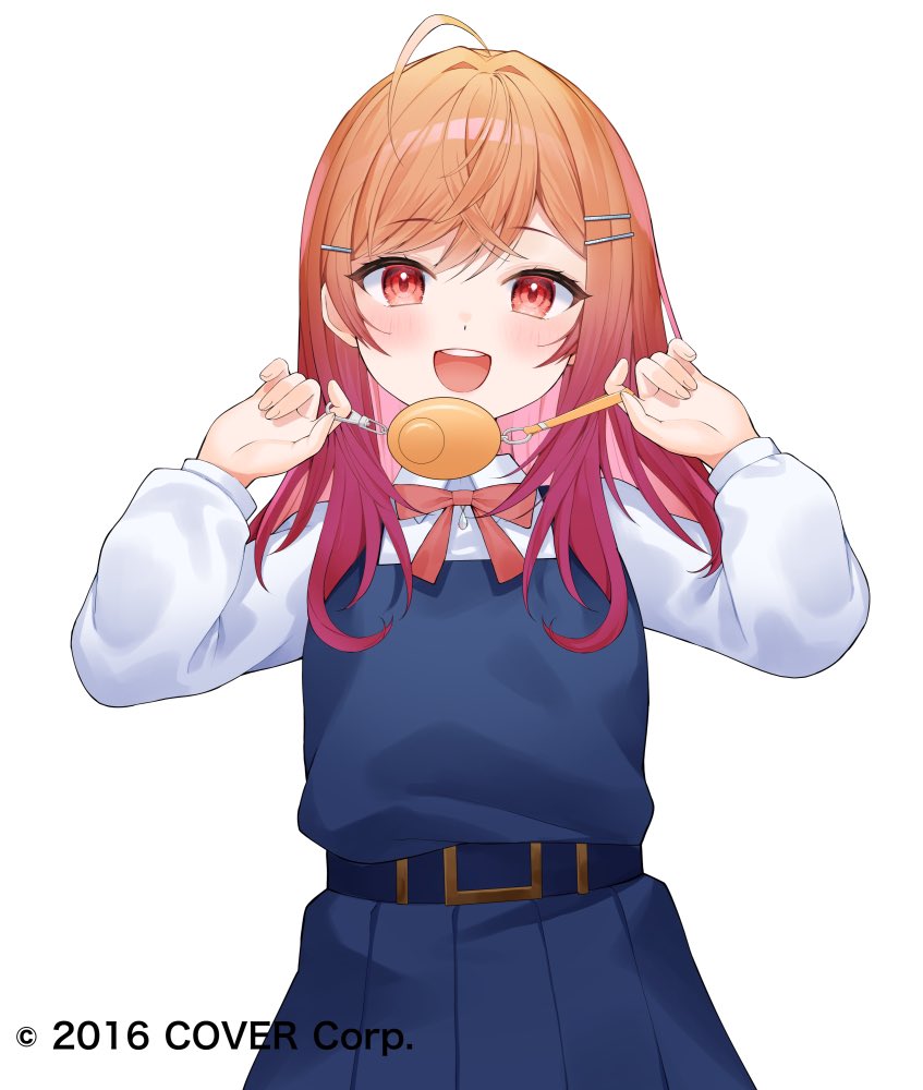 1girl :d aged_down ahoge blue_dress bow bowtie collared_shirt colored_inner_hair commentary_request cosplay crime_prevention_buzzer crime_prevention_buzzer_threat dress gradient_hair hair_ornament hairclip hololive hololive_dev_is ichijou_ririka long_hair long_sleeves looking_at_viewer multicolored_hair nemuzzz_nemu official_art open_mouth orange_eyes orange_hair pinafore_dress pink_hair pleated_dress pose_imitation red_bow red_bowtie school_uniform shigure_ui_(vtuber) shigure_ui_(vtuber)_(cosplay) shigure_ui_(young)_(vtuber) shirt shukusei!!_loli-kami_requiem sleeveless sleeveless_dress smile solo swept_bangs teeth upper_teeth_only virtual_youtuber white_shirt