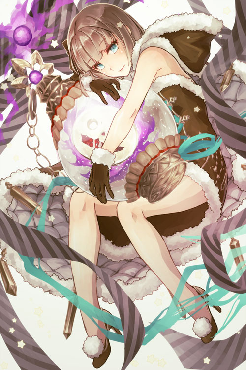 1boy bad_id bad_twitter_id black_gloves blunt_bangs blush bob_cut bow brown_hair cage cape chain closed_mouth dress fur-trimmed_gloves fur-trimmed_hood fur_trim gloves green_eyes gretel_(sinoalice) hair_bow hansel_(sinoalice) high_heels holding holding_cage hood hood_down looking_at_viewer male_focus moo_alice_moo ribbon simple_background sinoalice smile star_(symbol) trap