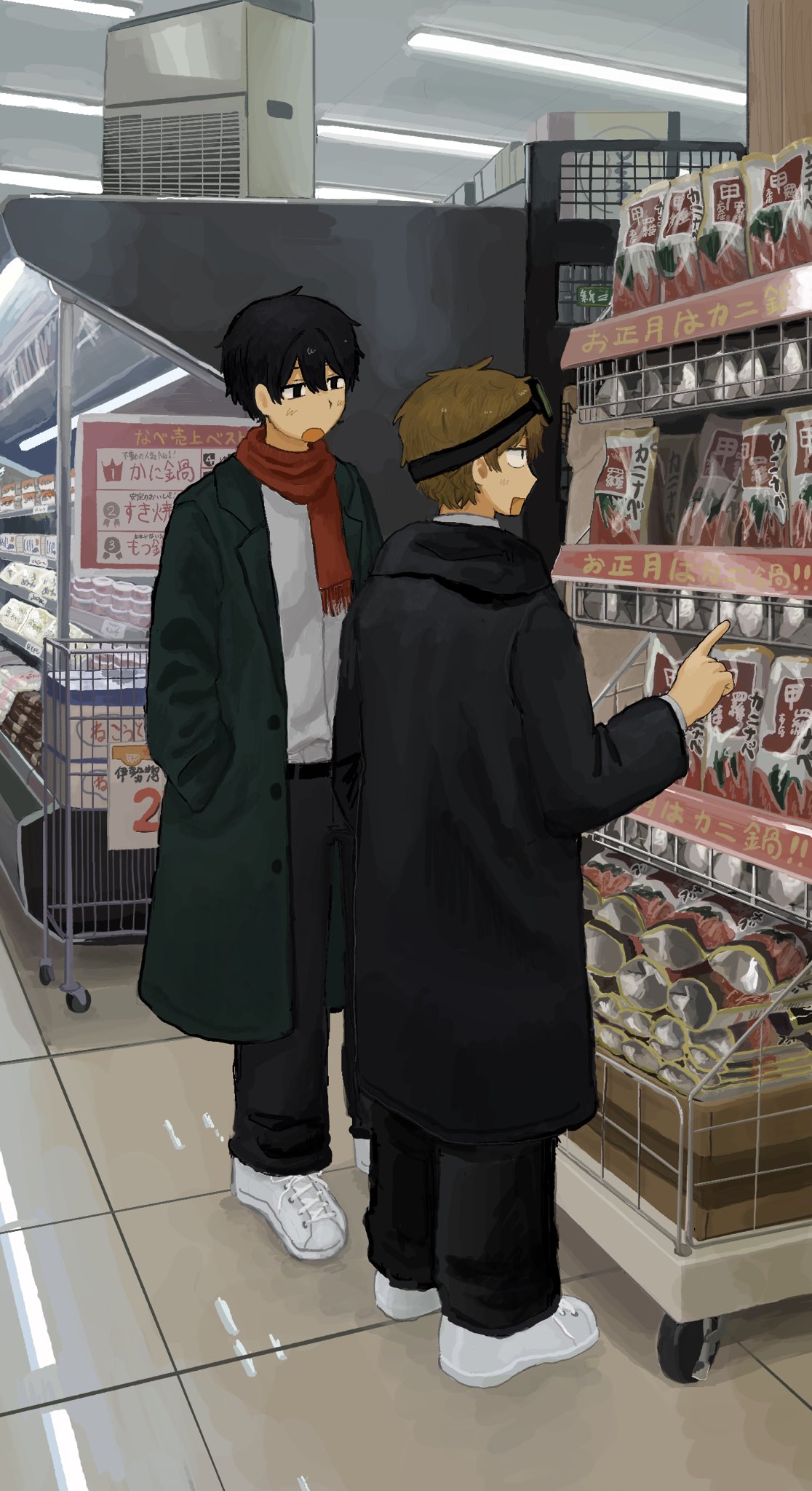 2boys black_eyes black_hair black_pants brown_hair ceiling_light coat floor goggles goggles_on_head green_coat hair_between_eyes hands_in_pockets highres indoors lapels male_focus multiple_boys nekono_09 open_mouth original pants reflective_floor shirt shoes short_hair standing supermarket white_shirt white_shoes
