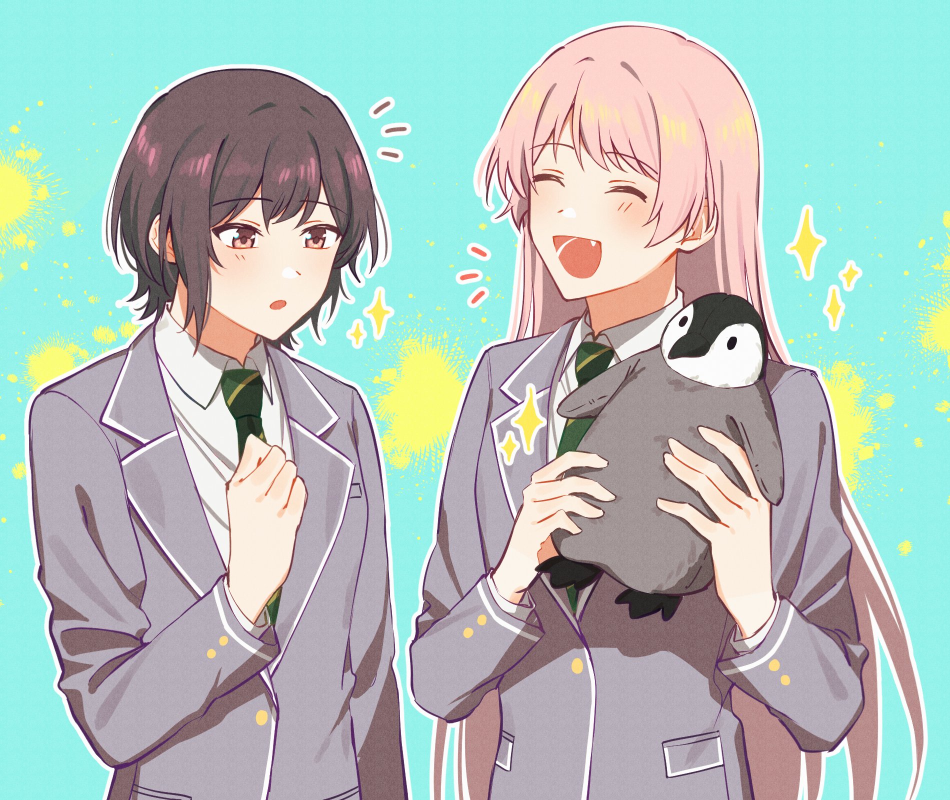 2girls bang_dream! bang_dream!_it's_mygo!!!!! blush brown_eyes chihaya_anon closed_eyes collared_shirt commentary diagonal-striped_clothes diagonal-striped_necktie fang green_necktie grey_hair grey_jacket haneoka_school_uniform highres jacket long_hair multiple_girls necktie open_mouth pink_hair school_uniform shirt short_hair striped_clothes stuffed_animal stuffed_penguin stuffed_toy untranslatable_commentary takamatsu_tomori thea01010 white_shirt