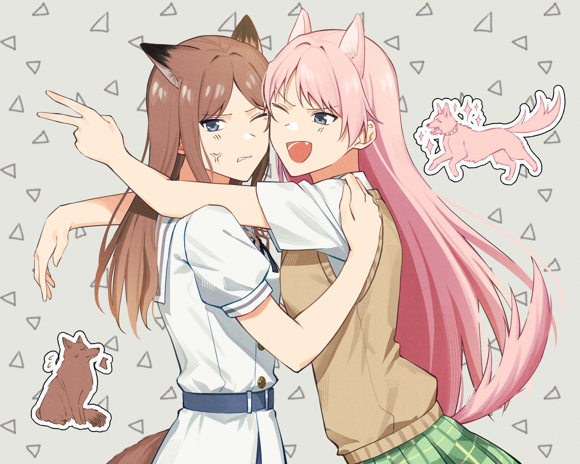 2girls age_difference anger_vein animal_ears bang_dream! bang_dream!_it's_mygo!!!!! belt blue_belt blue_eyes blush brown_hair brown_sweater_vest chihaya_anon commentary dog_ears dog_girl dog_tail dress fang green_skirt grey_eyes haneoka_school_uniform highres hug kemonomimi_mode long_hair multiple_girls nagasaki_soyo onee-shota open_mouth pink_hair plaid_clothes plaid_skirt pleated_skirt school_uniform shirt short_sleeves sidelocks skirt sweater_vest untranslatable_commentary tail thea01010 tsukinomori_school_uniform white_dress white_shirt yuri