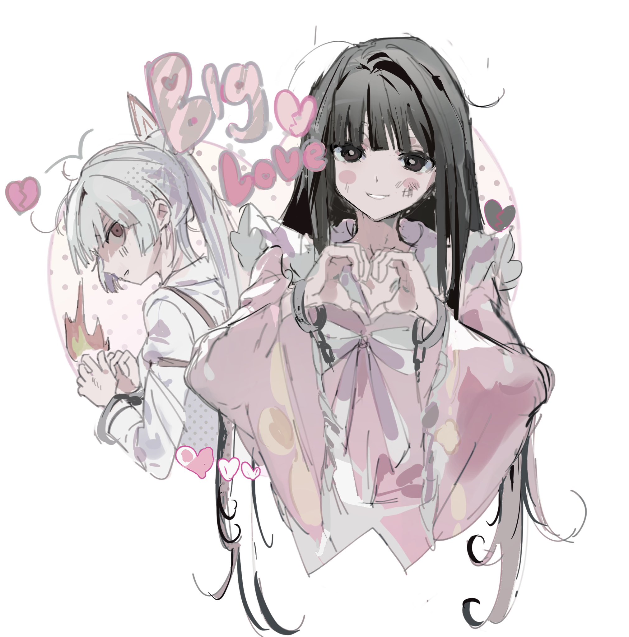 2girls black_eyes black_hair blush cuffs fire fujiwara_no_mokou handcuffs heart heart_hands highres hime_cut houraisan_kaguya long_hair long_sleeves looking_at_viewer multiple_girls pink_shirt ponytail puffy_sleeves red_eyes sesmkun shirt smile teeth touhou upper_body very_long_hair white_hair white_shirt