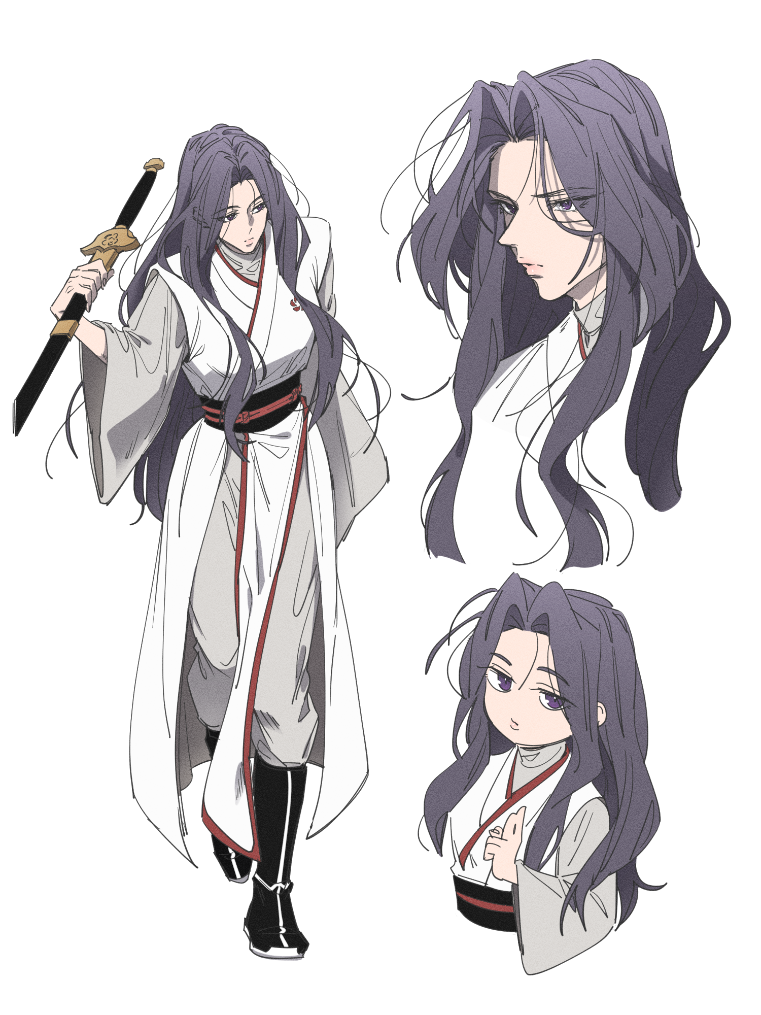 1girl black_boots black_sash boots chibi chibi_inset chinese_clothes closed_mouth full_body gahya00 grey_pants hanfu highres holding holding_sheath holding_sword holding_weapon jian_(weapon) korean_commentary kuji-in long_hair long_sleeves looking_ahead looking_to_the_side multiple_views pants purple_eyes purple_hair return_of_the_mount_hua_sect sash sheath sheathed simple_background sword upper_body weapon white_background white_hanfu wide_sleeves wuxia yu_iseol_(return_of_the_mount_hua_sect)