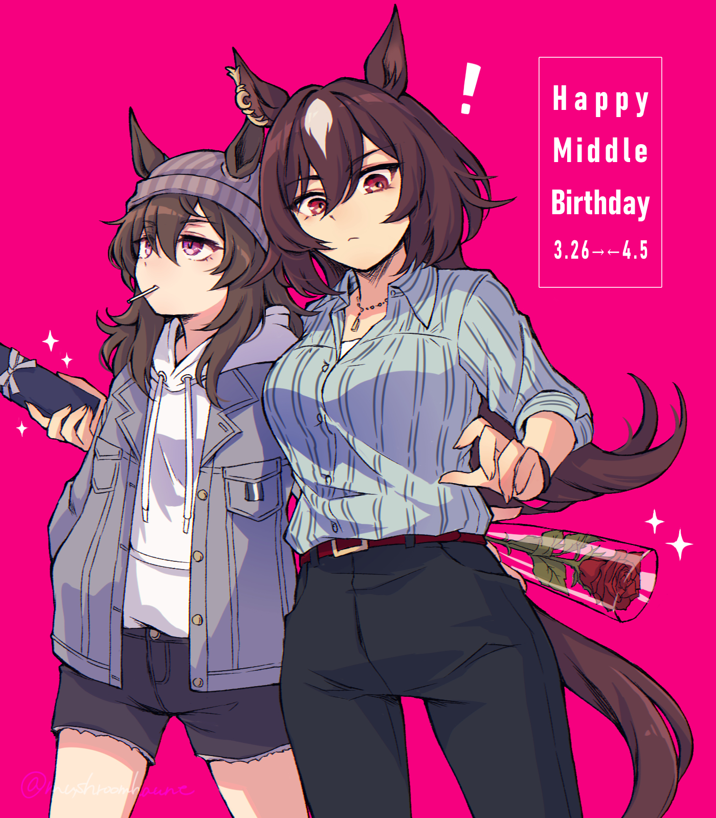 ! 2girls animal_ears beanie belt black_pants black_shorts breasts brown_belt brown_hair brown_tail collared_shirt commentary couple cowboy_shot dress_shirt ear_ornament ears_through_headwear flower frown gift grey_hat grey_jacket hair_between_eyes happy_birthday hat highres holding holding_flower holding_gift hood hood_down hoodie horse_ears horse_girl horse_tail jacket jewelry large_breasts looking_down multicolored_hair multiple_girls nakayama_festa_(umamusume) namuko necklace pants pink_background purple_eyes red_eyes red_flower red_rose rose shirt shorts simple_background sirius_symboli_(umamusume) sparkle streaked_hair striped_clothes striped_shirt tail twitter_username umamusume vertical-striped_clothes vertical-striped_shirt white_hair white_hoodie yuri