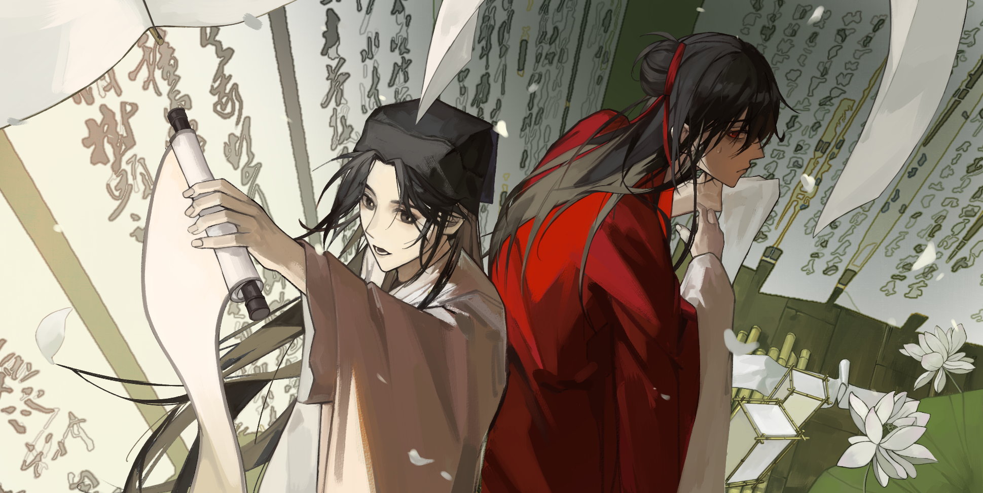 2boys bishounen black_eyes black_hair black_hat chinese_clothes chinese_commentary dao_gui_yi_xian flower hair_bun hair_ribbon hanfu hat highres holding holding_scroll indoors jin_(headwear) lantern li_huowang long_hair long_sleeves male_focus multiple_boys paper petals profile red_eyes red_hanfu red_ribbon ribbon robe scroll single_hair_bun upper_body very_long_hair white_flower white_hanfu wide_sleeves womumumu yaoi zhouzi_jin_(headwear) zhuge_yuan