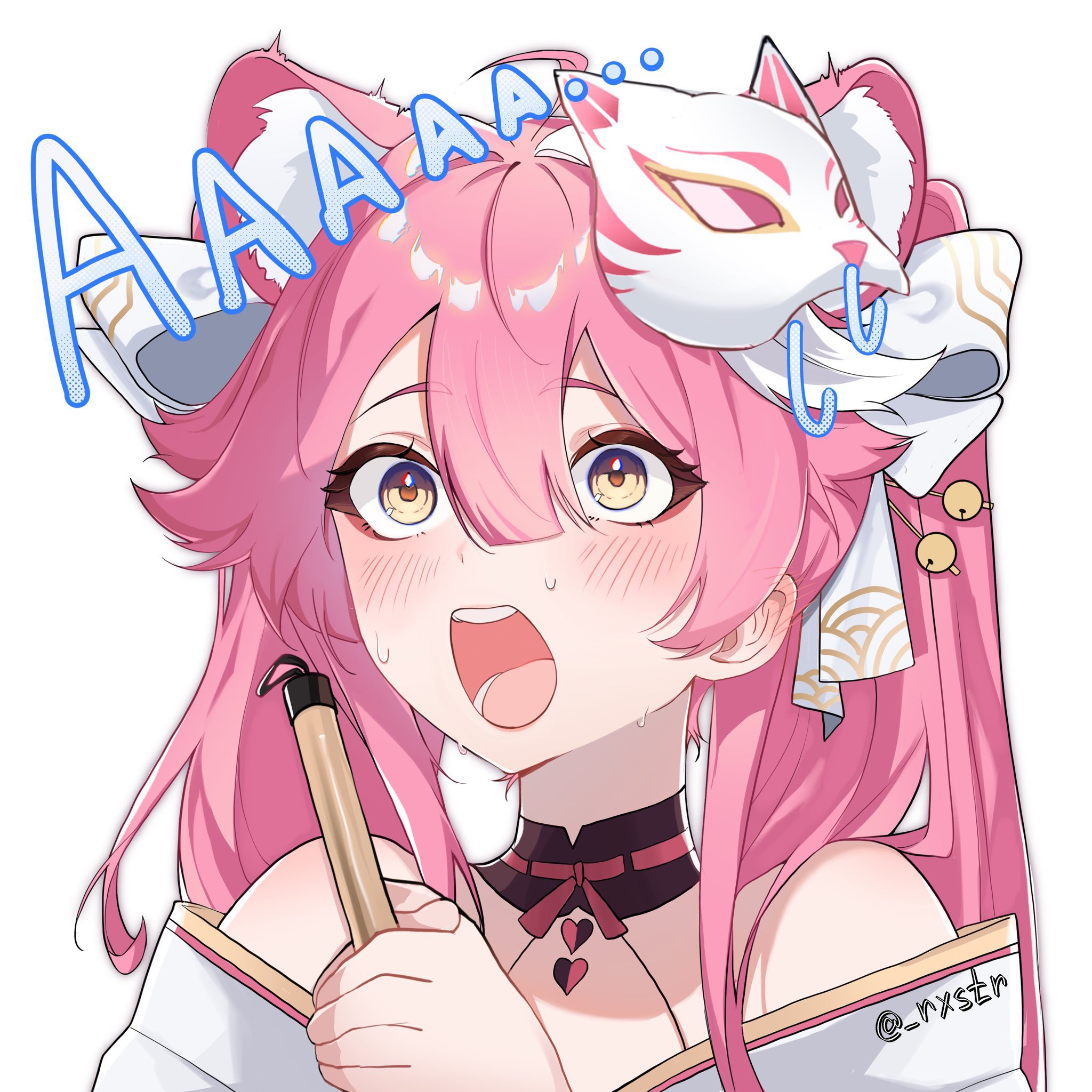 1girl andromeda_(rxstr) animal_ear_fluff animal_ears bare_shoulders black_choker blush breasts calligraphy_brush cat_mask choker commentary double-parted_bangs english_commentary extra_ears hair_between_eyes hair_ornament hair_stick hairpin highres holding holding_brush hololive hololive_english japanese_clothes kimono large_breasts long_hair mask mask_on_head off_shoulder official_alternate_costume official_alternate_hairstyle open_mouth paintbrush panther_ears pink_hair raora_panthera raora_panthera_(new_year) twintails virtual_youtuber white_kimono yellow_eyes