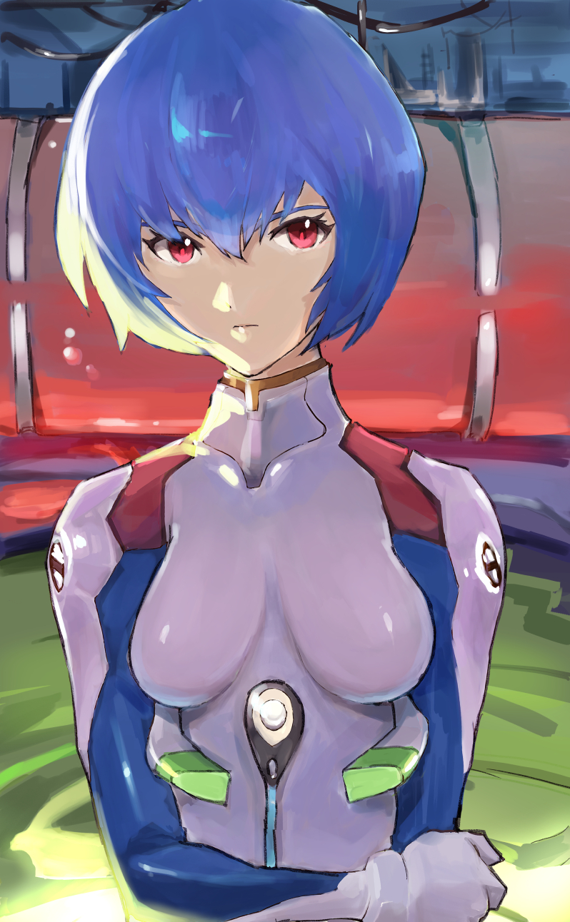 1girl :| arm_at_side ayanami_rei blue_hair bodysuit cable closed_mouth commentary expressionless eyelashes hair_between_eyes highres hand_on_own_arm looking_at_viewer massao_(abfobywnltuitiy) neon_genesis_evangelion red_eyes short_hair sidelighting solo upper_body white_bodysuit