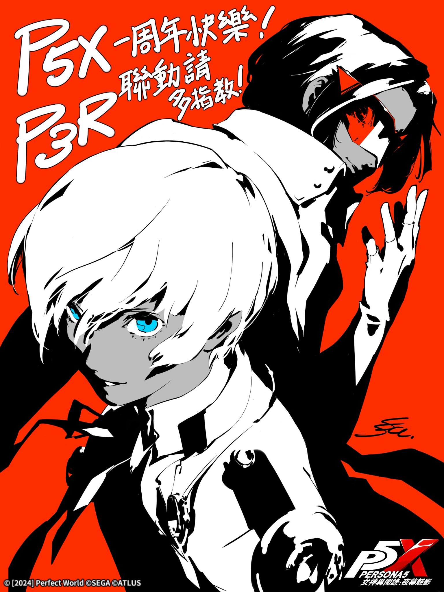 2boys artist_name blue_eyes chinese_commentary chinese_text closed_mouth commentary_request copyright_name copyright_notice grin hand_up highres kamishiro_nagisa logo looking_at_viewer male_focus mask multiple_boys neck_ribbon official_art persona persona_3 persona_3_reload persona_5 persona_5:_the_phantom_x red_background ribbon short_hair signature simple_background smile soejima_shigenori spot_color translation_request upper_body wonder_(p5x) yuuki_makoto_(persona_3)